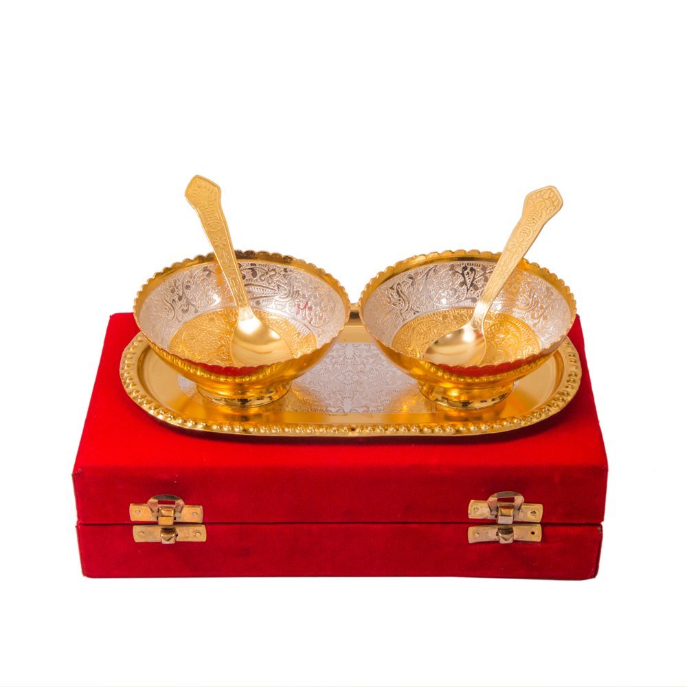 Gifts Brass Bowl Set with Spoons and Tray (Pack of 5) Used for Home Decor, Serving and Gifting/German Silver Gift for Pooja