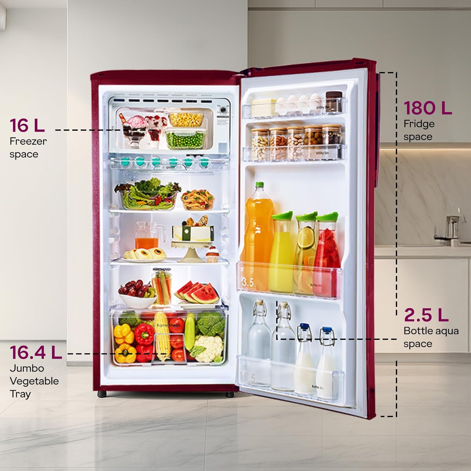 Capacity 180 L: Suitable for families with 2 to 3 members | Freezer capacity: 16.5 L, Fresh food capacity: 163.5 L