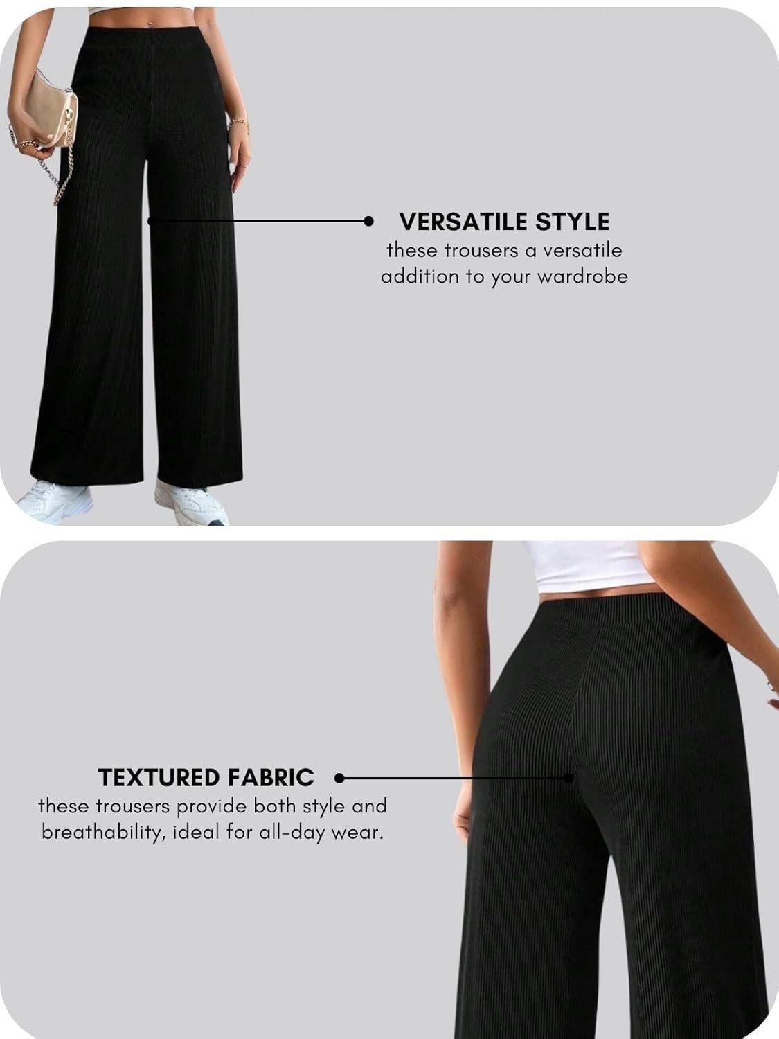 The high-waisted trousers feature a wide-leg design, providing comfort and a modern, chic look.