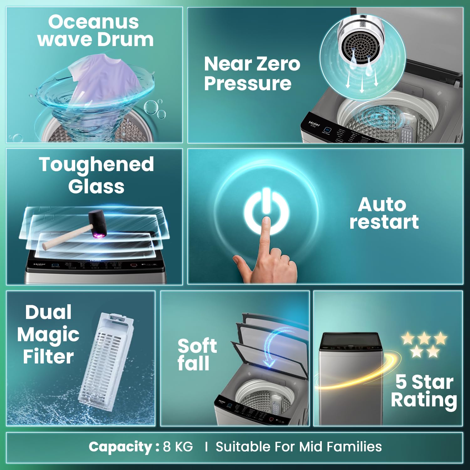 Key Performance Features: Oceanus Wave Drum : for better washing | Magic Filter : For better lint collection | Fuzzy : Auto water duction | Near Zero Pressure: 0.01MPA pressure inlet will work | Auto Restart: Memory backup