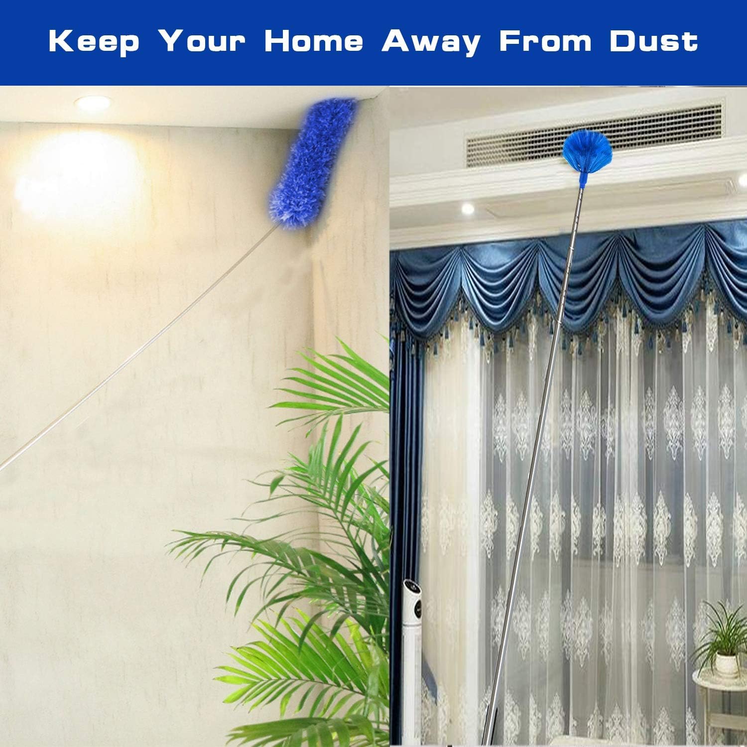 [ DOUBLE DUSTER HEAD ] : Ceiling fan duster set includes [ Cobweb duster x 1; Microfiber duster x 1 ; telescopic rod x 1.] Feather duster kit is very suitable for cleaning furniture, ceilings, ceiling fans, stairs, windowsills, cobwebs.