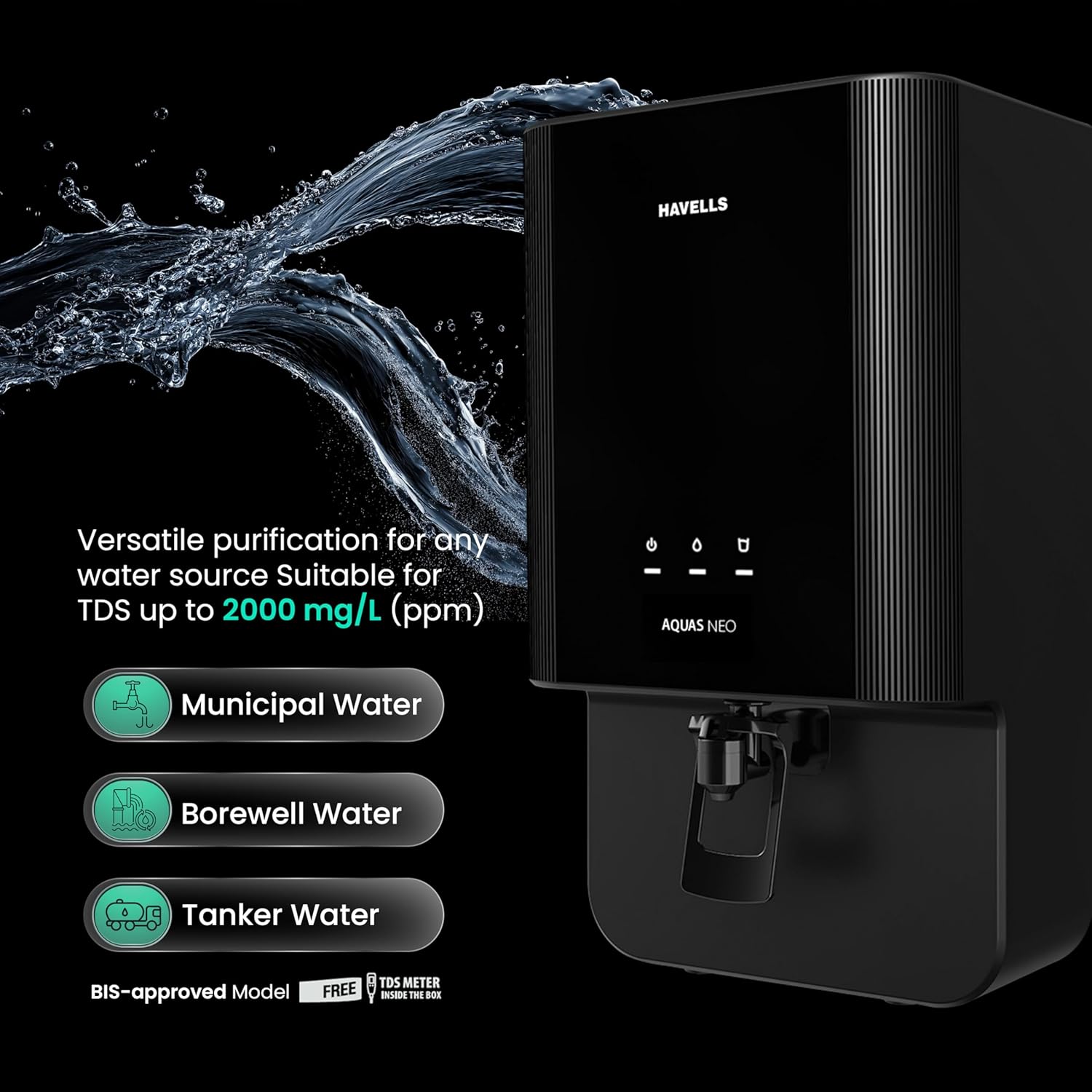 AMPLE STORAGE AND HIGH TDS HANDLING : Havells water purifier comes with a 7-litre storage tank to ensure continuous access to clean water. It effectively purifies water with TDS levels up to 2000 ppm, making it suitable for a wide range of water sources and household needs