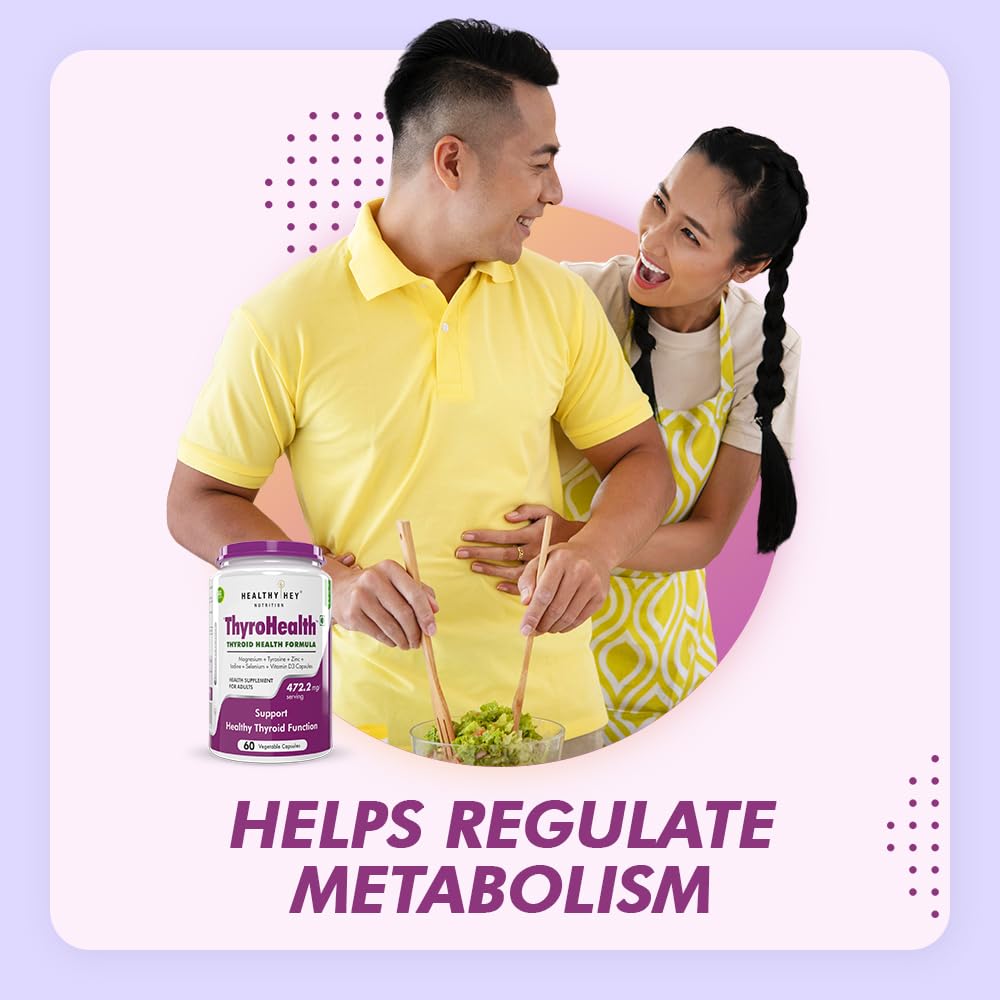 HealthyHey Nutrition ThyroHealth is a premium thyroid supplement, expertly formulated to support thyroid health with 472.2 mg per serving in 60 vegetable capsules, inspired by the principles of thyroid ayurvedic medicine.