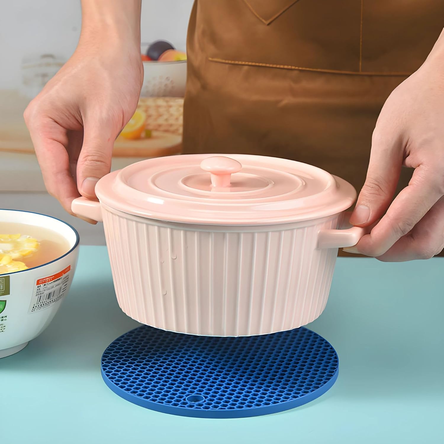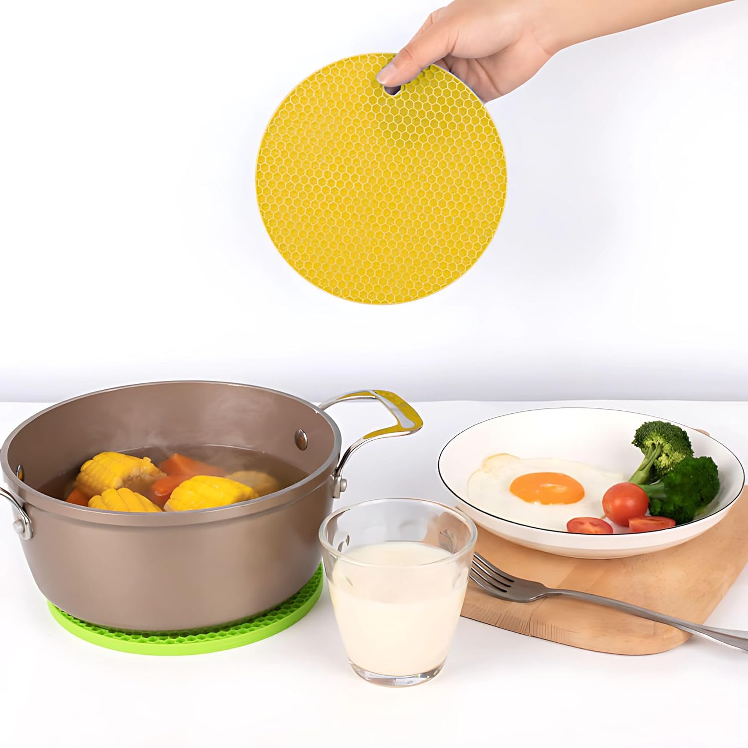 Add a splash of color and style to your kitchen with these round silicone trivet mats, thoughtfully designed to provide both functionality and aesthetic appeal. Each set includes four mats in four different colors, allowing you to mix and match to suit your kitchen décor or create vibrant table settings for any occasion. The round shape offers a modern and versatile design, providing ample surface area to hold hot pots, pans, dishes, and other cookware safely.The inclusion of four distinct colors in one set adds a cheerful and decorative touch, helping to brighten your kitchen or dining space while maintaining functionality. Ideal for home chefs, busy kitchens, or anyone looking to combine modern round design with colorful versatility, these mats are a stylish and essential accessory that enhances both the safety and visual appeal of your kitchen environment.