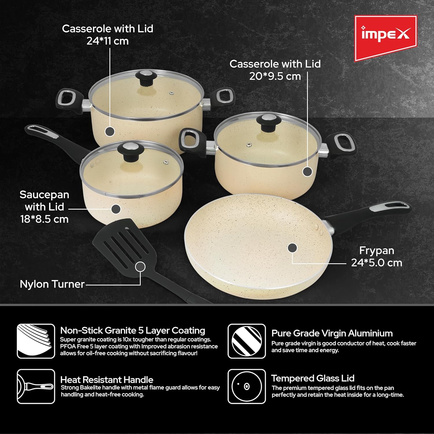 7-Piece Set: Comprehensive cookware set includes a Saucepan with Lid 24cm,Saucepan with lid 20cm,Milkpan with Lid,Frypan (24 cm) and spatula.