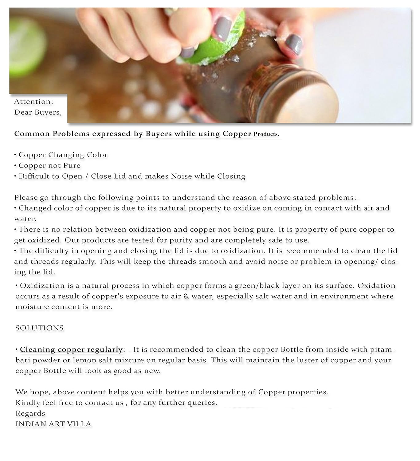 Cleaning instuctions: (a). Inside: put some cleaning powder with hot water in the bottle. Shake well for few minutes and clean with normal water. Cleaning with brush is not required. (b). Outside: don’t use scrubber or chemicals. Bottle is lacquer coated for copper use soft cloth to wipe water drops and remove stains on the bottle. Small blackish spots may form on the bottle due to oxidization as pure copper used in indianartvilla bottle