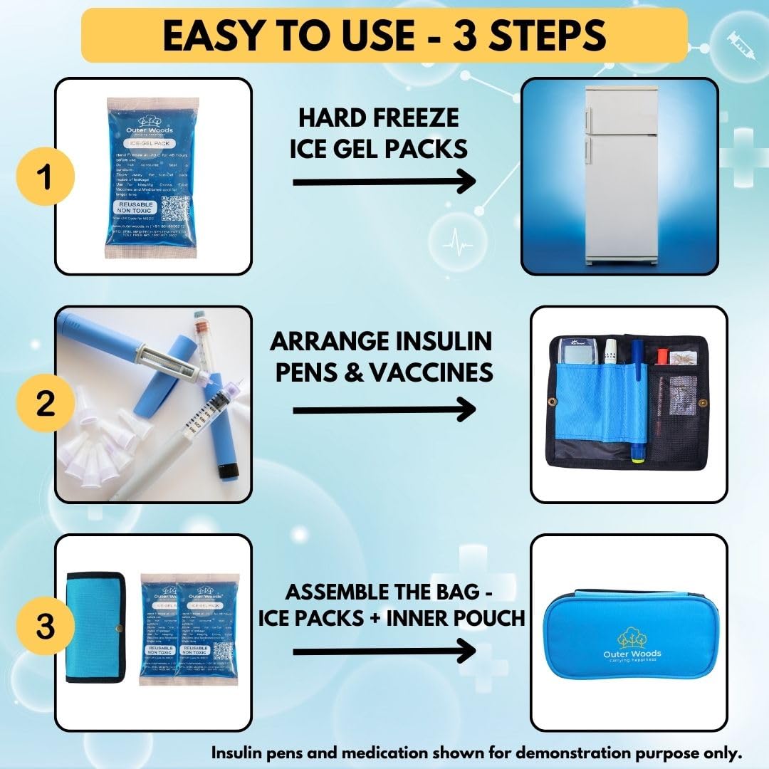 Freeze the Ice Gel Packs – Place both gel packs in the deep freezer on maximum cooling mode until fully hardened.Prepare the Inner Pouch – Arrange insulin pens, vials, and medications neatly inside the organiser pouch.Assemble the Bag – Insert the frozen gel packs and the loaded inner pouch into the insulated cooler bag.