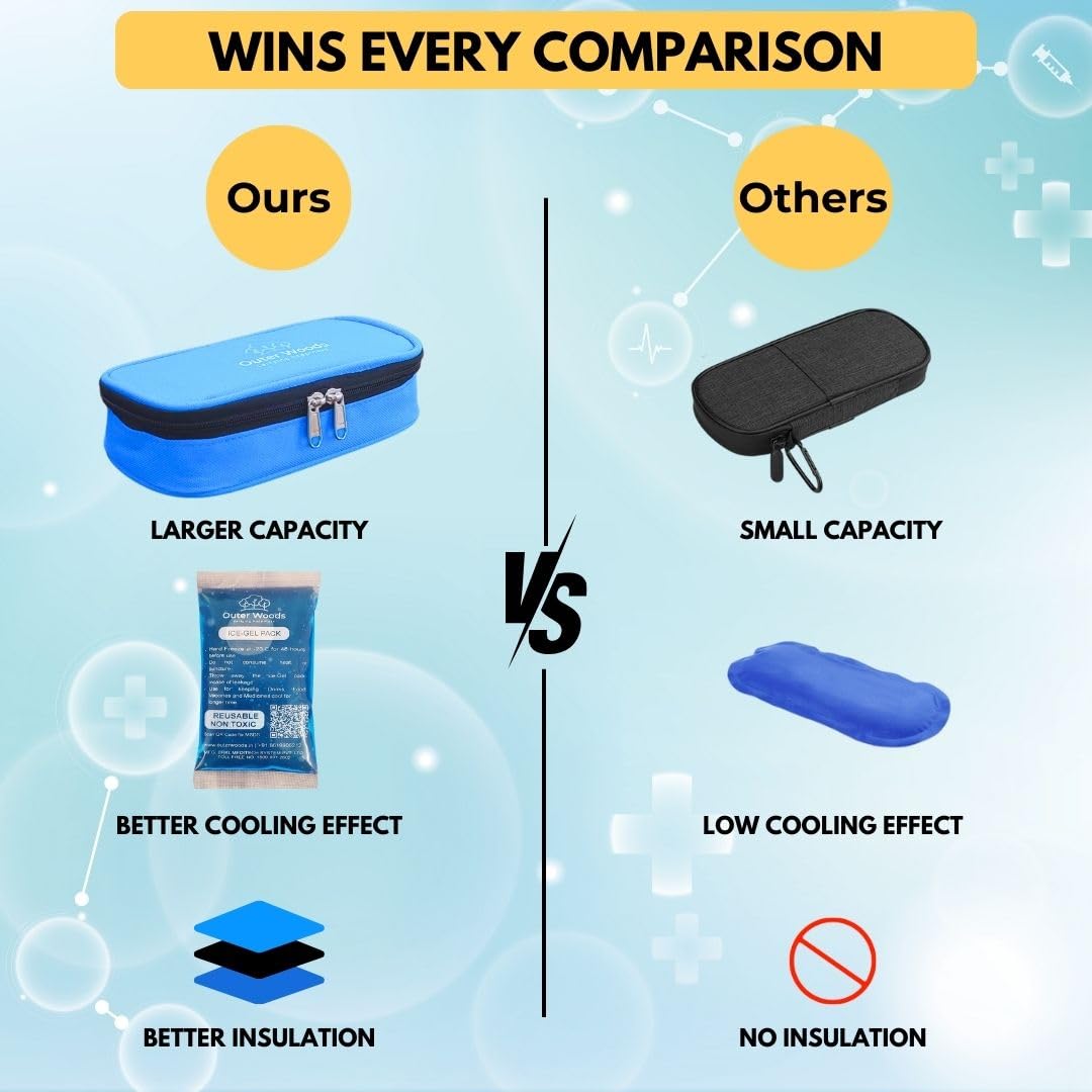Proven 6+ Hours Cooling Outer Woods delivers reliable 6+ hours of temperature control with two hard-freeze gel packs and 360° insulation—many generic pouches fade after 2–3 hours.Effortless, No-Fuss Setup Simple three-step use (freeze → organise → assemble). No complicated inserts or loose parts—truly plug-and-go compared to fiddly, single-pack pouches.Smart Inner Organiser Pouch Dedicated slots for insulin pens, vials, and meds keep everything secure and quickly accessible. Most alternatives are just one open cavity, causing clutter and risk of damage.Travel-Ready & Durable Compact, lightweight design fits handbags/backpacks; rugged build and smooth zip help maintain seal for better cooling. Many basic pouches compromise on zipper quality and insulation continuity.