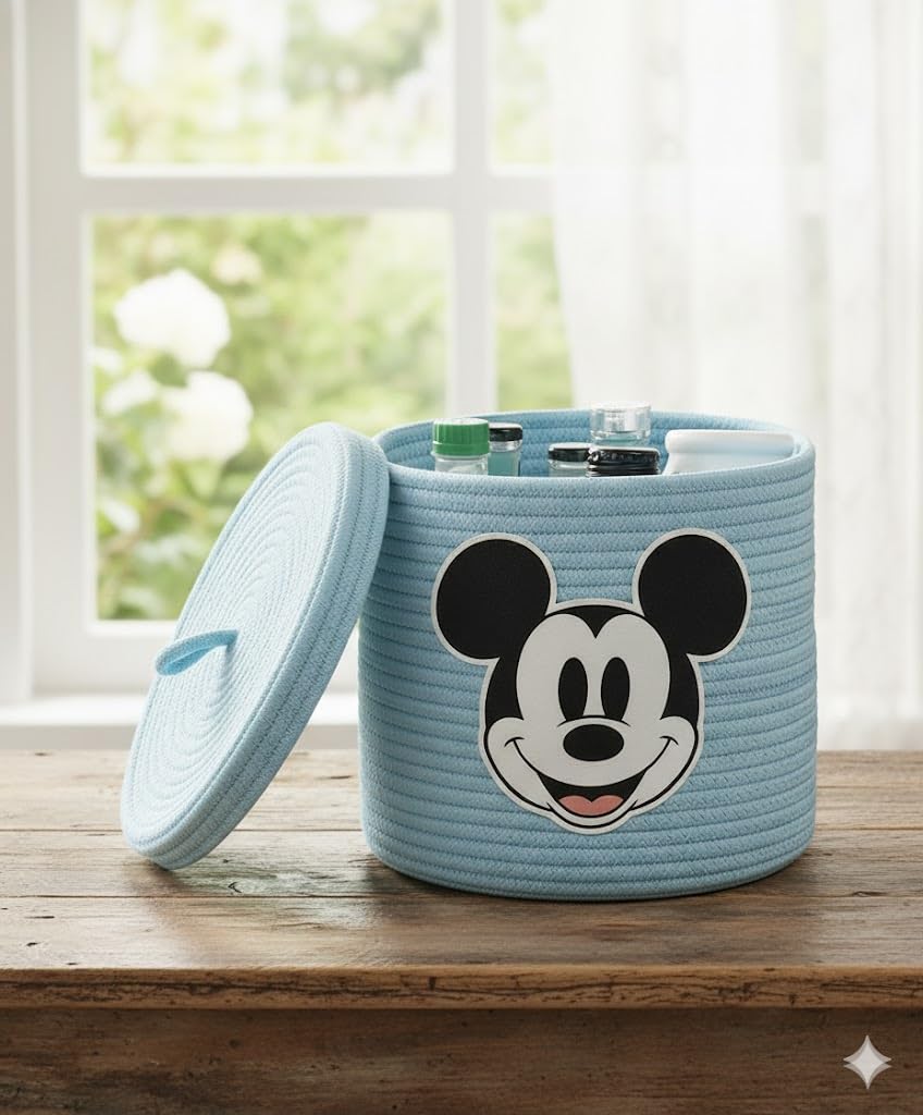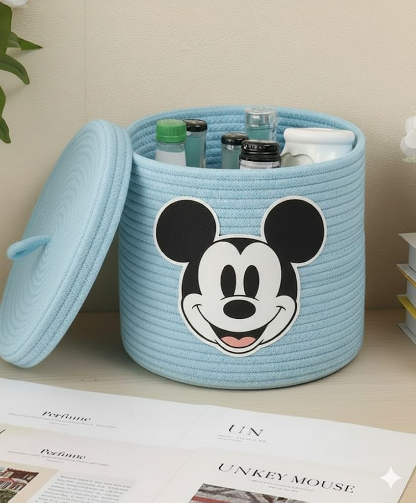 Jute Basket For Storage Cotton Rope Toys Basket With Lid Handwoven Natural Foldable Laundry Hamper for Home, Office, Living Room Size 10×10 inch (aqua micky)
