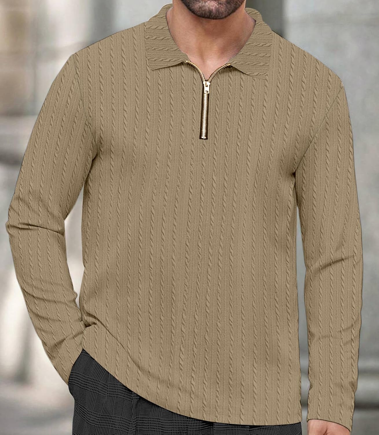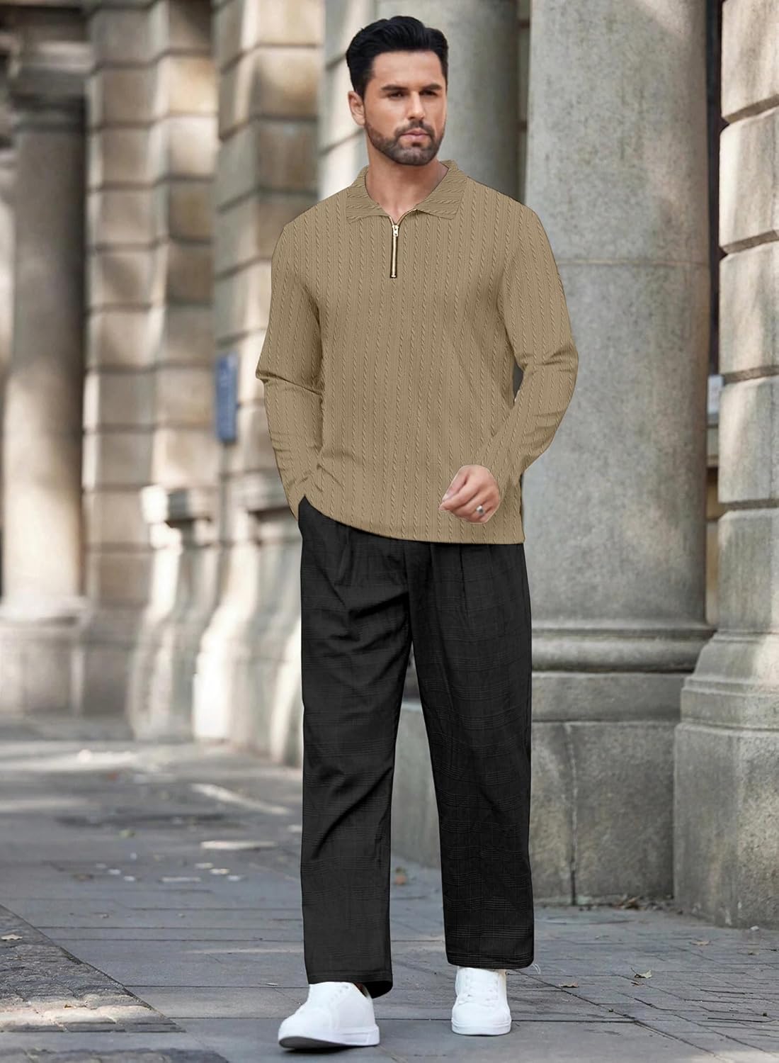 Elevate your casual wardrobe with this sophisticated quarter-zip polo t-shirt from Kajaru. The standout feature is its distinctive JCard textured pattern, creating an eye-catching geometric design across the fabric. The short-sleeved silhouette offers both style and comfort, perfect for various occasions. The premium collar design and metallic zip detail add a touch of refinement, while the textured fabric provides a luxurious feel and dimensional appearance. Available in versatile colours including brown, beige, and dusty pink, this polo pairs seamlessly with trousers or jeans for a polished look. The comfortable fit and quality construction ensure both style and durability, making it an excellent choice for modern gentlemen who appreciate attention to detail in their clothing. Ideal for casual outings, semi-formal events, or smart-casual office wear, this polo t-shirt combines contemporary design with classic appeal.