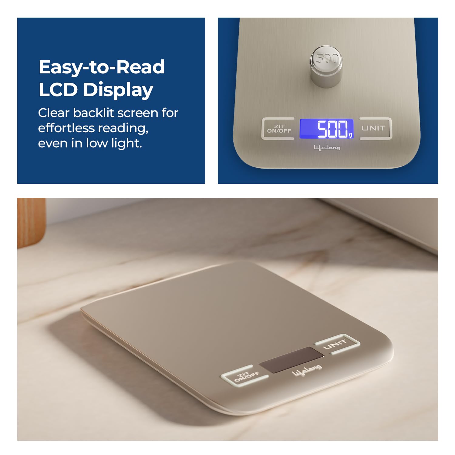Backlit LCD Display – The clear, easy-view LCD screen with blue backlight ensures visibility even in low-light kitchens. Stay focused on your recipe without straining your eyes.