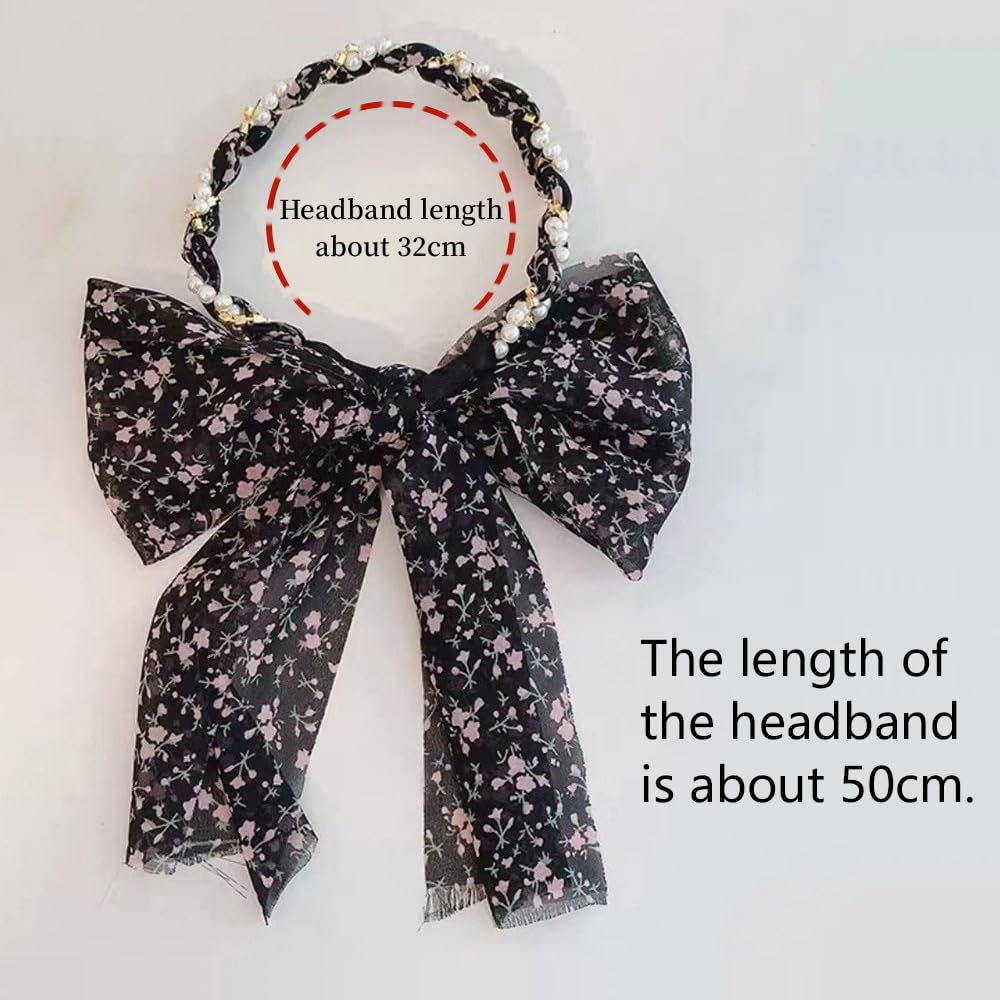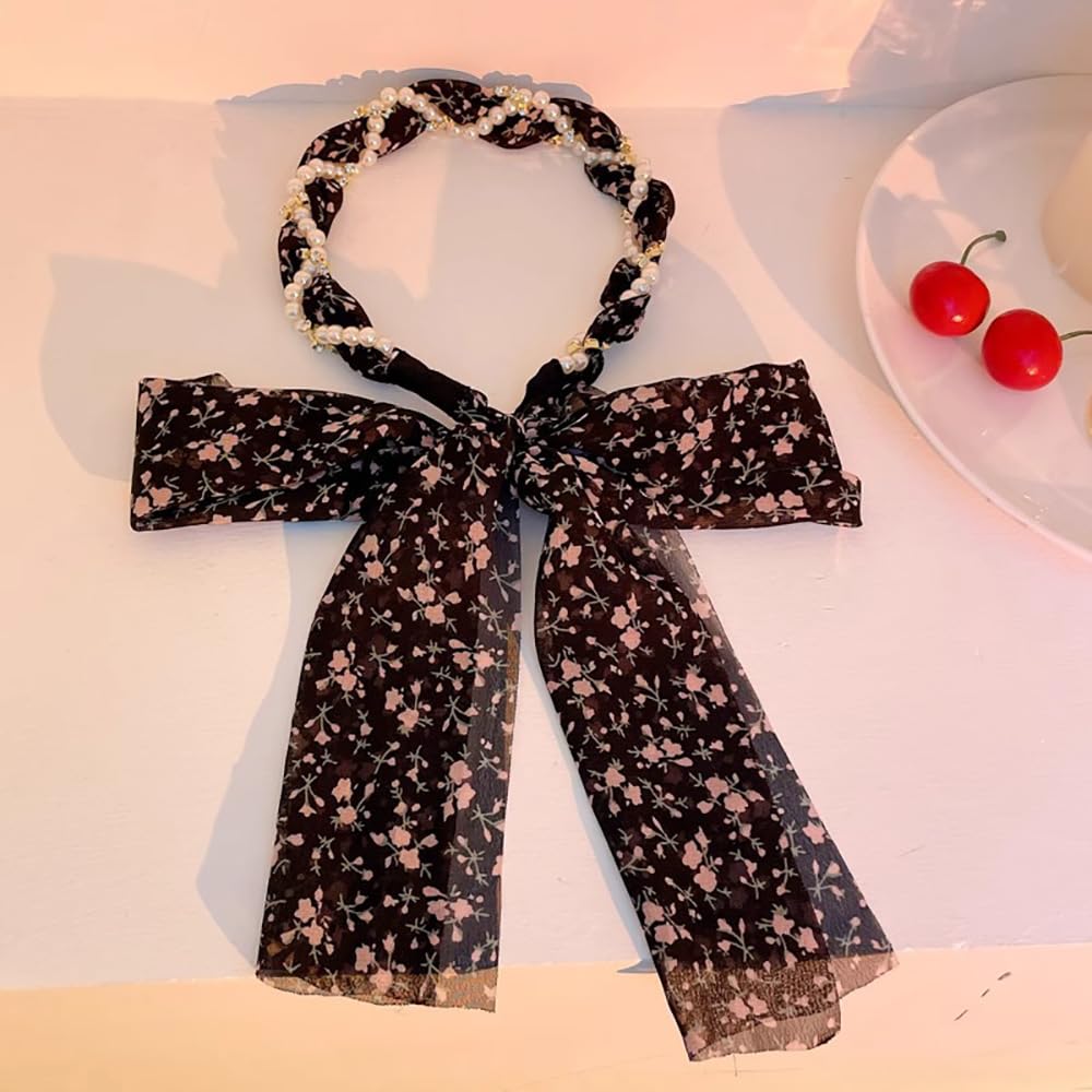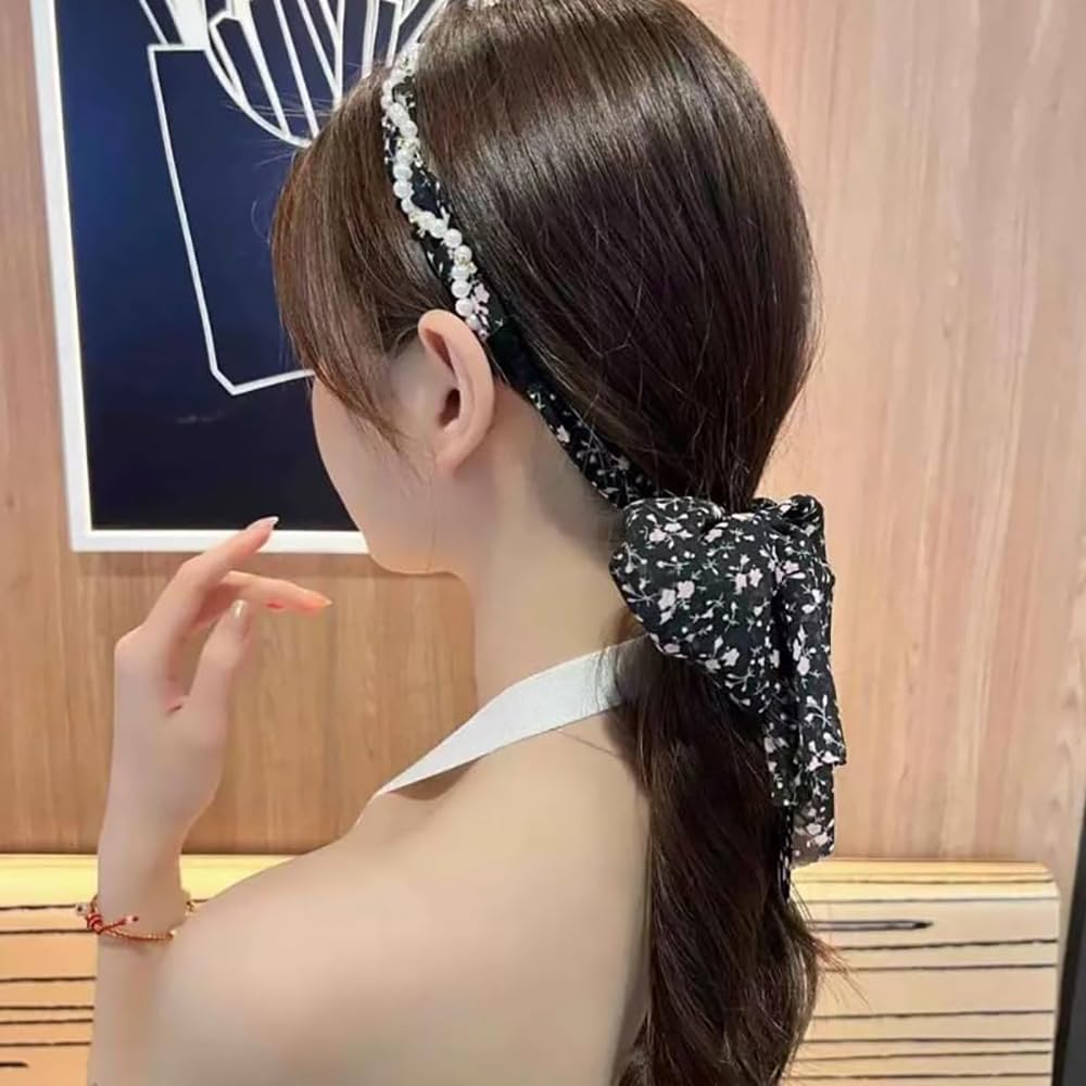 Long Ribbon Headband, Black Pearl Flower Hair Ribbons For Girls Women, Boho Braided Hair Ties, Elegant Bow Hair Bands Head Scarf Bands For Teen Girl Ponytail Fashion Hair Accessories For Women
