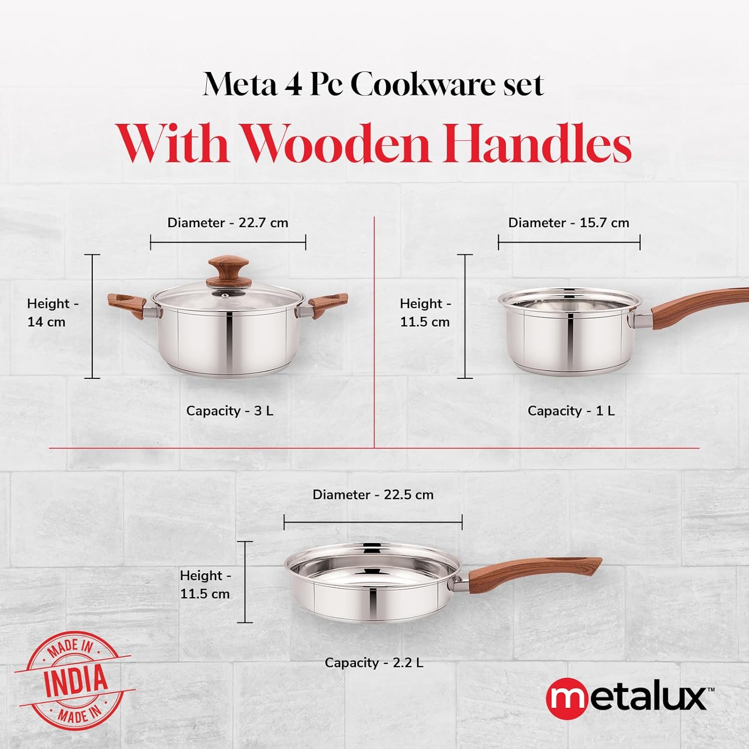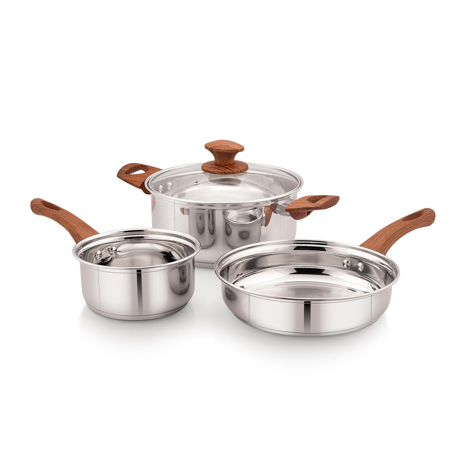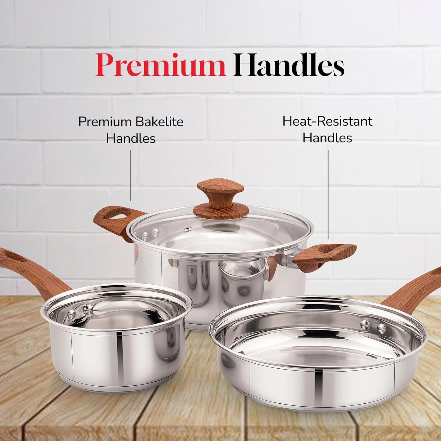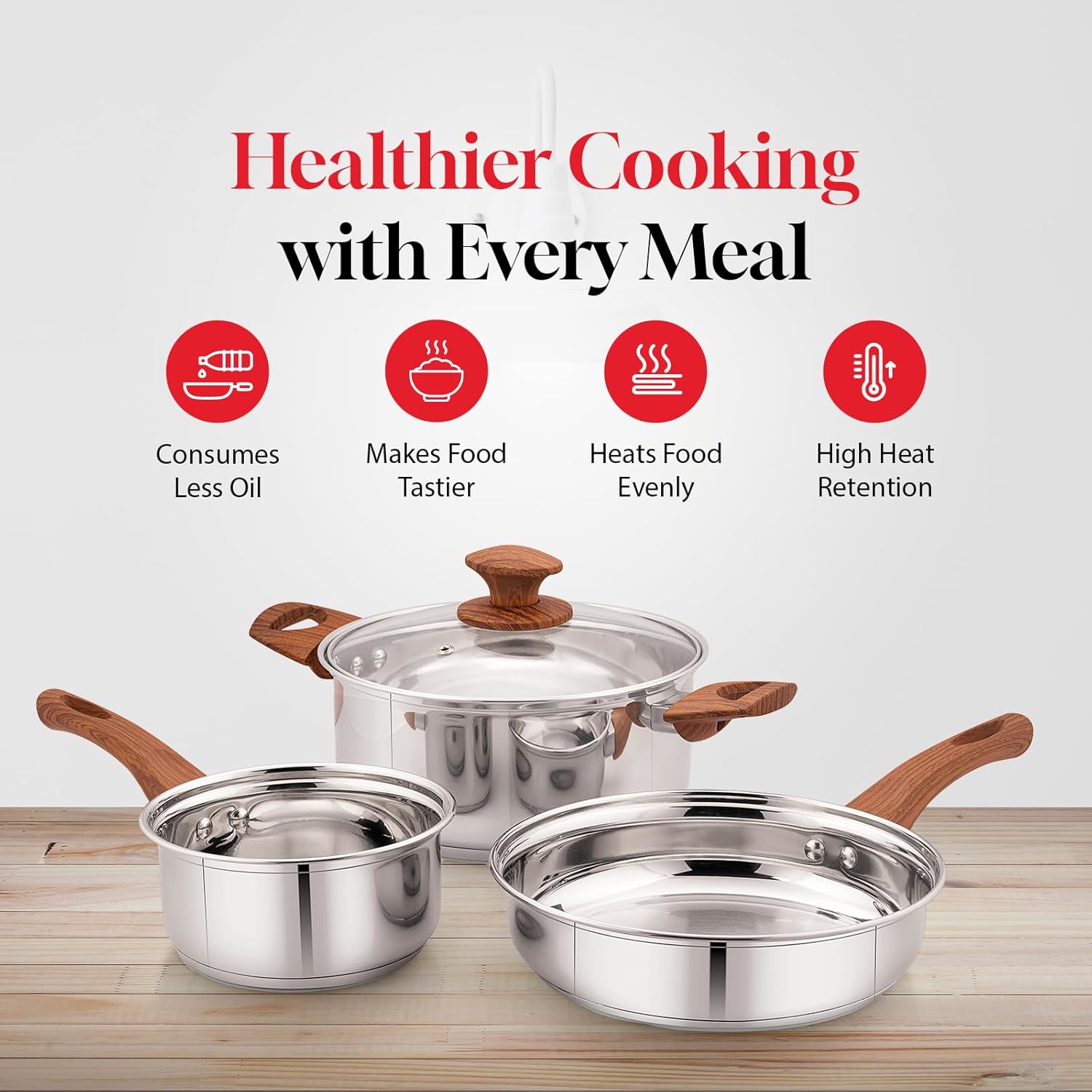 Ergonomic Design with Wooden Handles – Each steel pan for cooking features stylish heat-resistant wooden handles for a firm, comfortable grip and a touch of elegance in your kitchen.