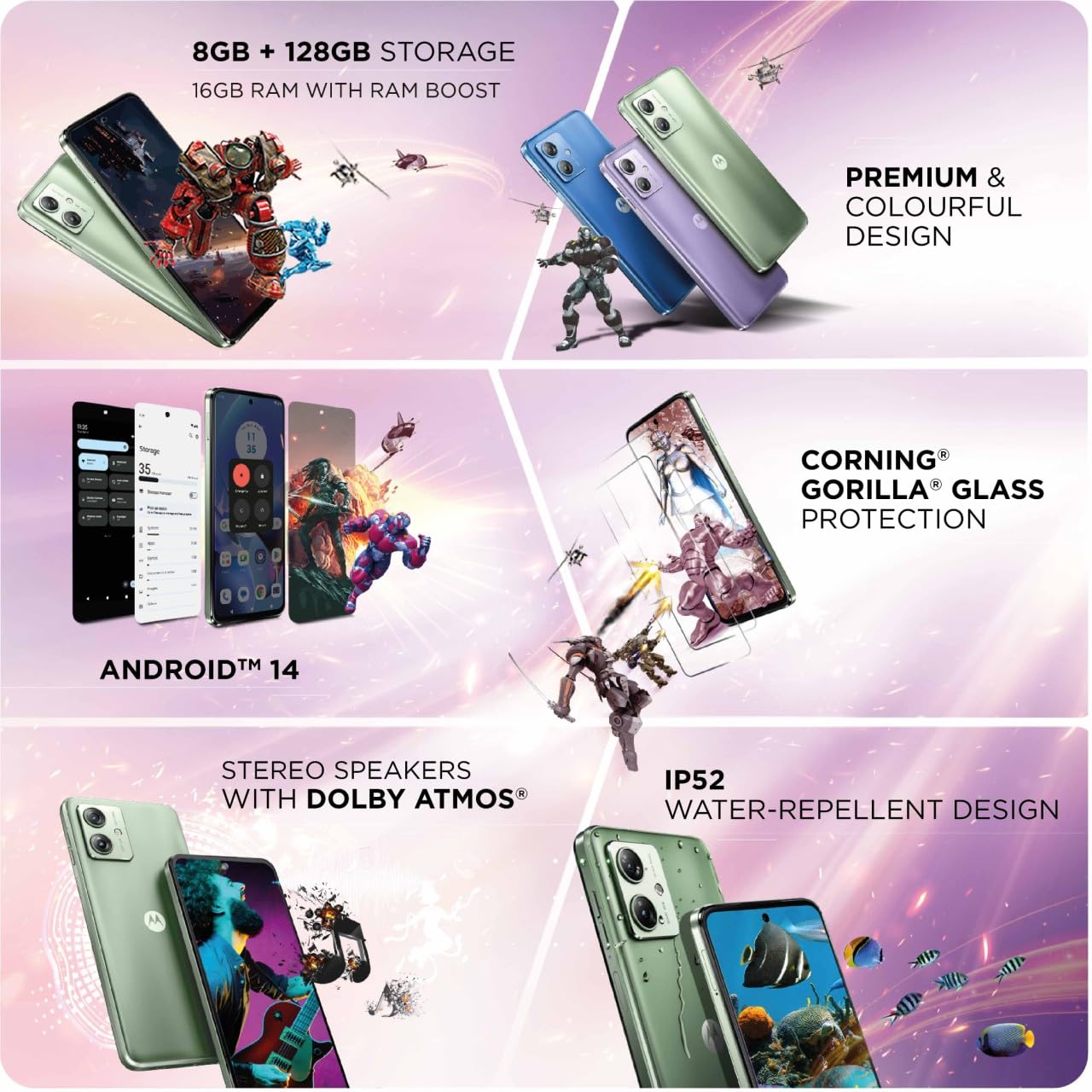 Unleash the ultimate performance with the MediaTek Dimensity 7025 octa-core processor. The powerful octa-core processor offers an unbelievably smooth experience while gaming, multi-tasking, or consuming content. MediaTek Dimensity 7025 is based on 2.5GHz frequencies that bring you Superfast 5G performance, an unparalleled camera experience, efficient video processing, and superior gaming capabilities. Its advanced 5G technology ensures faster downloads and better power efficiency, making it the perfect choice for those who demand the best.The moto g64 5G, powered by a leading 6000mAh battery, promises endless entertainment on the go. Dive into the fastest 5G world without the fear of running out of power. Its robust 6000mAh battery supports all-day use to work and play as much as you want without worrying about running out of juice. This battery is designed to last you all day today and well into tomorrow. With TurboPower 33W charger, you can get hours of power in just minutes, so you can recharge your phone quickly and easily.Experience smooth performance with the 8 GB RAM + 128 GB storage smartphone. Effortlessly navigate through your apps on the moto g64 5G that’s powered by an impressive in-built 12 GB of memory. Say goodbye to storage woes because, with 128 GB internal storage, you have ample space for photos, movies, songs, apps, and games. This phone enables smooth multitasking and provides ample space for all your multimedia content with LPDDR4X memory type and UFS 2.2 storage. Whether it’s gaming, binge-watching, expansive playlists, essential apps, or capturing moments the moto g64 5G can handle it all effortlessly. And if you need more space, you can expand the storage further with a microSD card of up to 1 TB.Capture the beauty of the world with the advanced Shake Free 50MP camera, equipped with OIS for ultra-stable pictures and videos, accompanied by Quad Pixel technology for stunning low-light photos and incredibly smooth videos. This camera offers Exp
