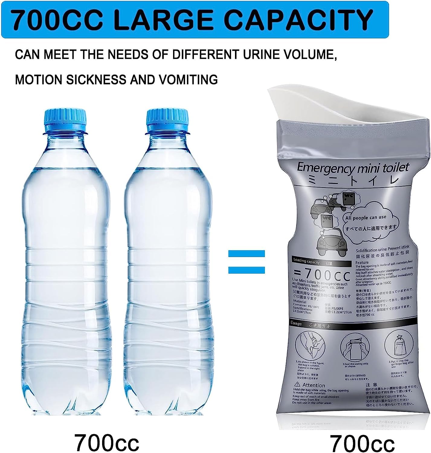 【Strong sealing, large capacity】Each packaging bag is equipped with a sealing strip, which is completely sealed, will not leak, and has no peculiar smell. The capacity of the urine bag is about 700 ml, which is sufficient for emergency situations.