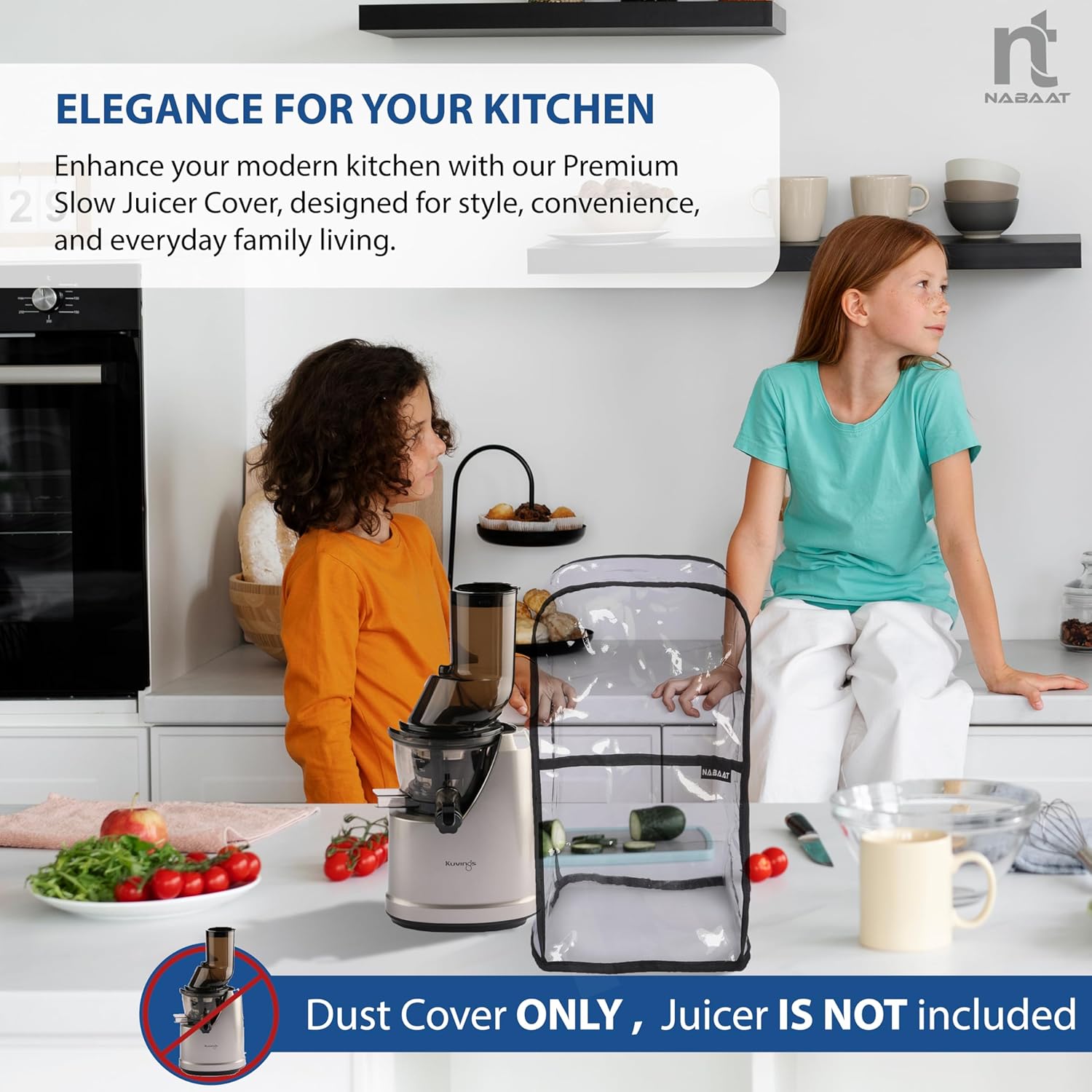 TRANSPARENT THICK MATERIAL: Nabaat Cold press juicer cover is made from transparent high-quality, heavy-duty waterproof material for long-lasting durability and keep the machine from erosion by the vapor.WIDE APPLICATION SIZE: Measuring 10(L) x 8(W) x 19(H) inches, this standard fit most standard Cold press juicer or also can be keep on some food processors appliances. (COVER ONLY)PROTECT YOUR JUICER: Nabaat Cold press juicer cover keeps your beloved juicer under wraps while being protected from various kitchen elements including dust, dirt, stains, spills, fingerprints, scratches and more. It is padded to prevent the small appliance from tiny impacts. You can be assured that you will have the juicer look as good as new.