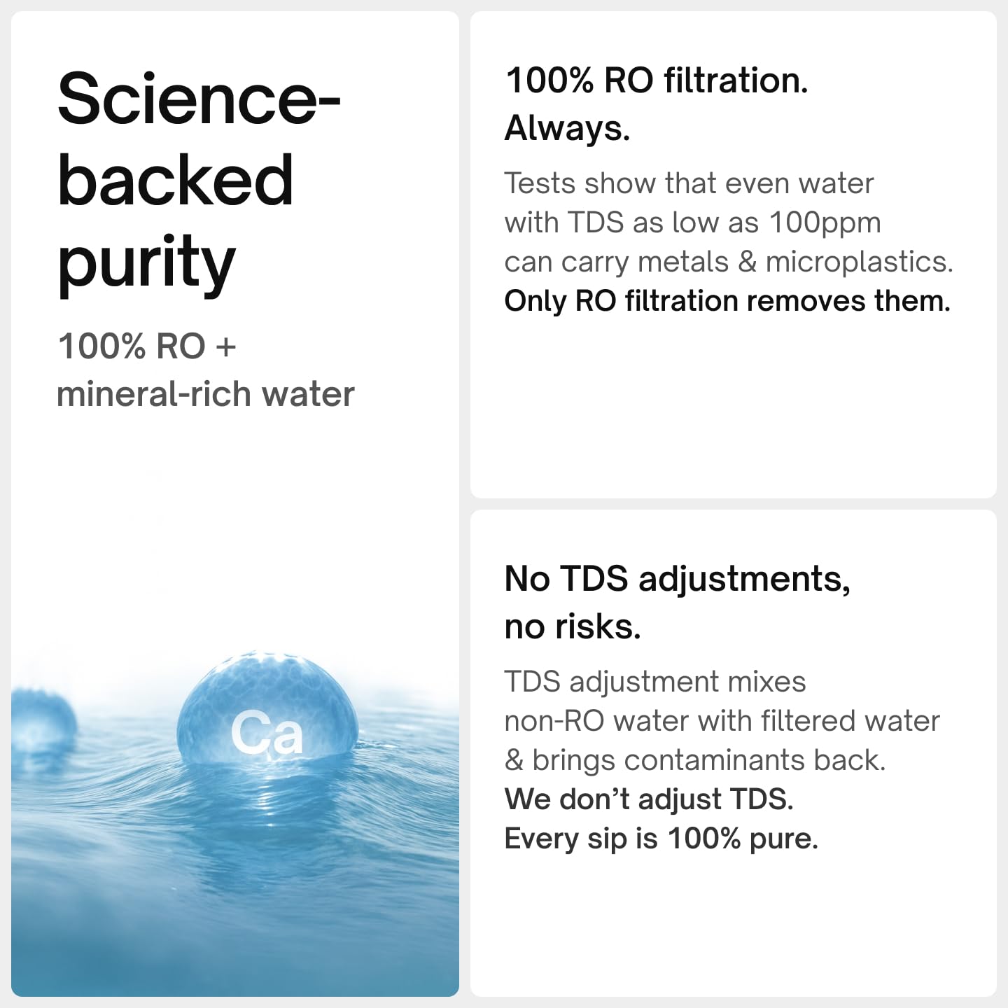 Science-Backed Purity, No Half Measures: Even low TDS water can hide metals and plastics. We eliminate all risks with 100% RO processing, then restore essential minerals. No MTDS mixing, no RO bypassing either.