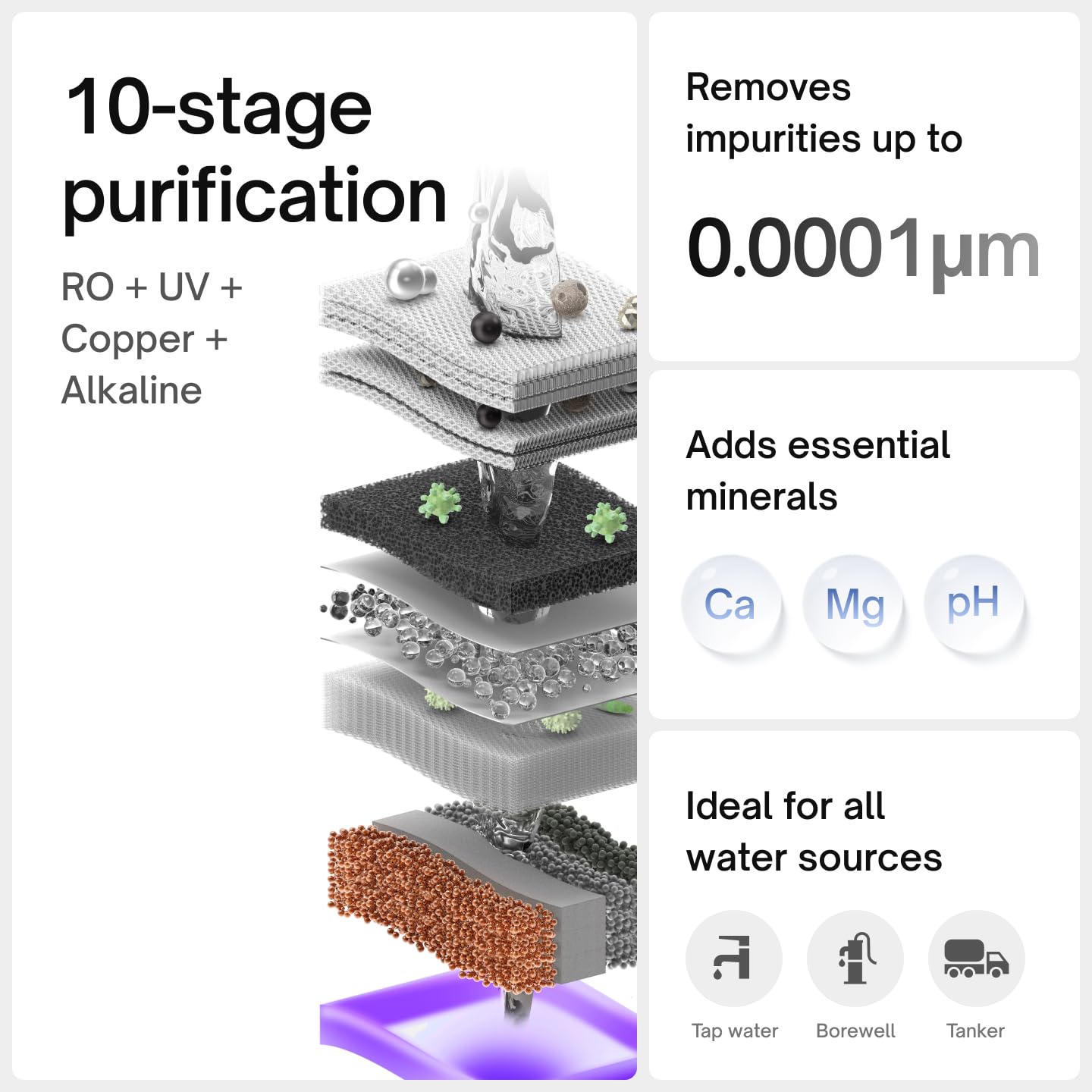 10-Stage Purifier: Complete purification with RO + UV + Alkaline + Copper. FDA and ISI certified, delivering 99.99% pure water enriched with essential minerals.