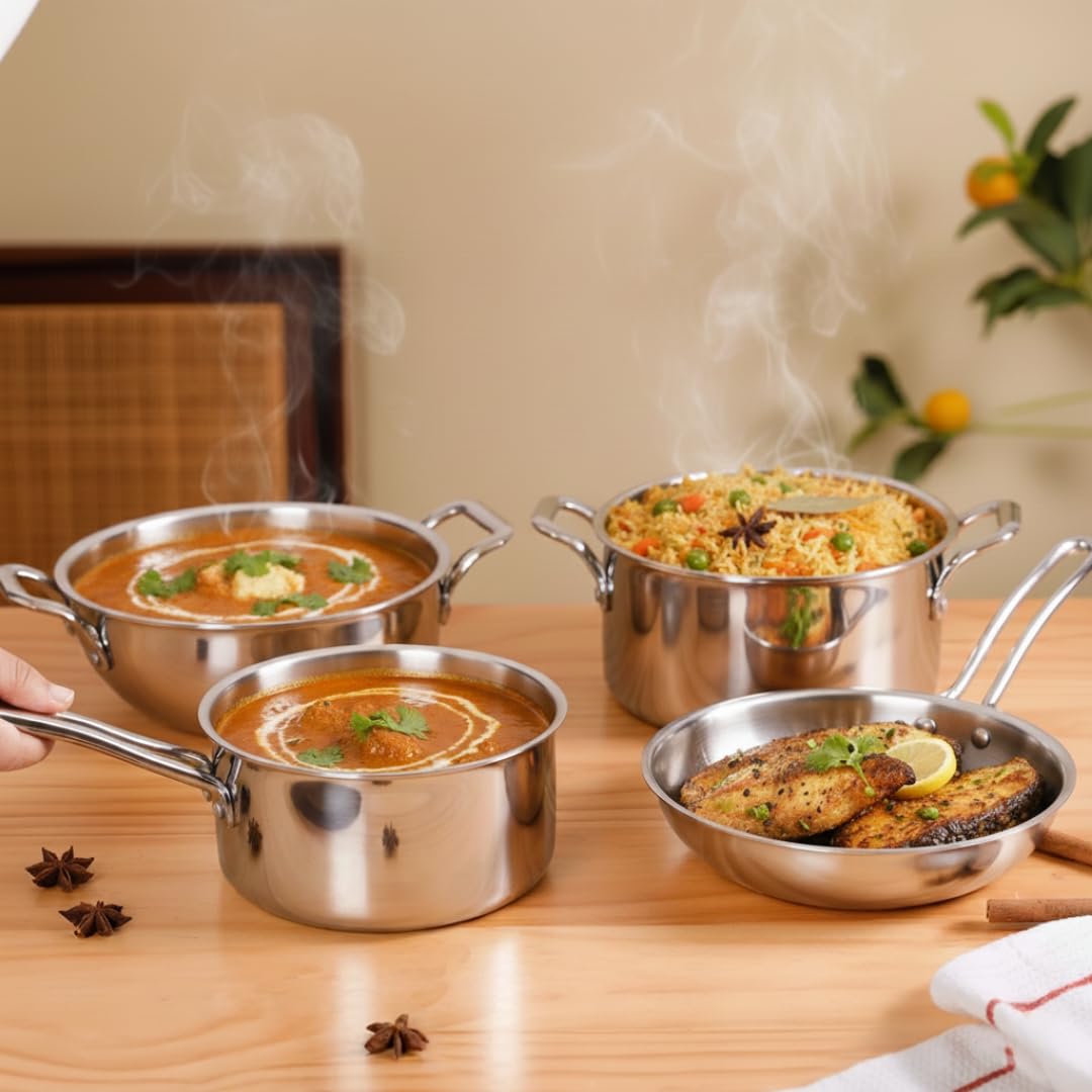 Complete Cookware Set: Includes a 20cm fry pan (1000 ml), 22cm kadai with lid (2250 ml), 16cm saucepan with lid (1500 ml), and 20cm casserole pot with lid (3000 ml) to cover everyday cooking needs.