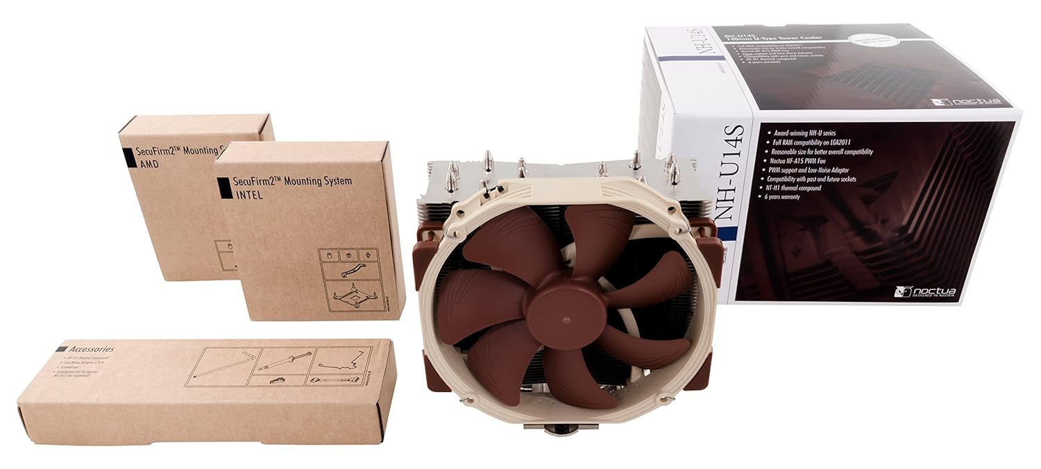 The NH-U14S is the 14cm top model of Noctua’s classic U-series single tower CPU coolers, which have received more than 400 awards and recommendations from the international press. While the large, six heatpipe design and the NF-A15 140mm fan with PWM support for fully automatic speed control allow the cooler to best the renowned quiet cooling performance of all other U-series coolers, its 52mm slim shape still assures full compatibility with tall RAM modules on LGA2011/LGA2066. Topped off with the trusted, pro-grade SecuFirm2 multi-socket mounting system and Noctua’s proven NT-H1 thermal compound, the NH-U14S is a complete premium quality solution that combines superb performance, high compatibility and quiet operation.