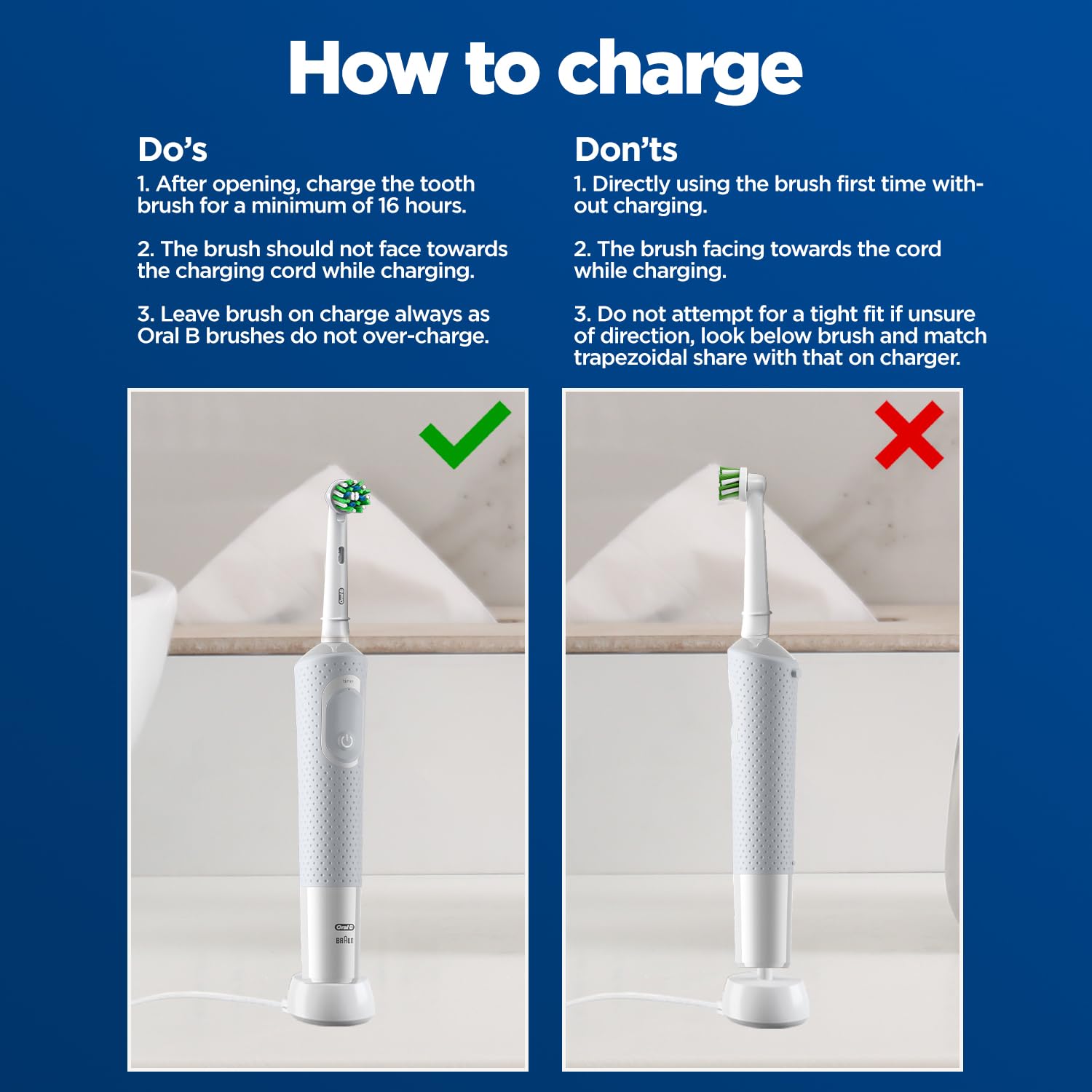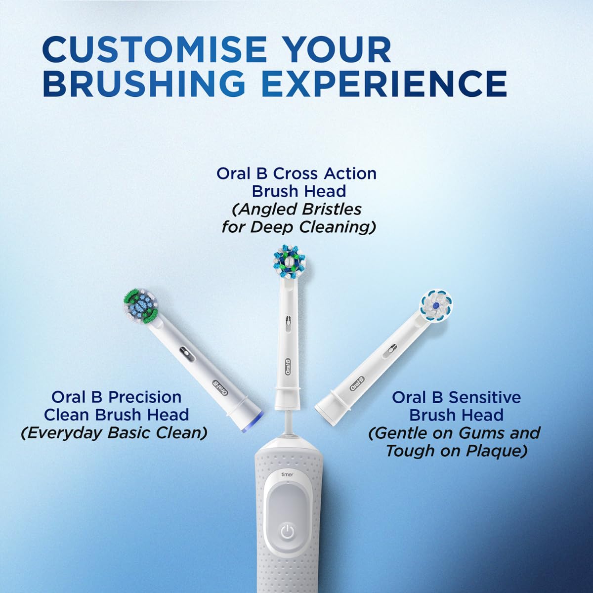 Introducing the Oral-B Vitality White Rechargeable Rotating Electric Toothbrush, the essential toothbrush for achieving a professional clean. Designed for adults, this electric toothbrush offers a superior brushing experience with its 2D Cleaning Action that oscillates and rotates to remove up to 100% more plaque compared to a regular manual toothbrush. The round brush head, with crisscross bristles angled at 16 degrees, cups each tooth for a more effective clean. Featuring a built-in professional 2-minute quadrant timer, it ensures you brush for the dentist-recommended duration, vibrating every 30 seconds to alert you to change the brushing area. With two brushing modes—Daily and Sensitive—it caters to both regular and sensitive teeth and gums. Waterproof with an IPX7 rating, this toothbrush is designed for durability and ease of use. Experience the dentist-inspired round brush head from Oral-B, the #1 brand recommended by dentists worldwide, and enjoy a 30-day money-back guarantee for a risk-free trial. Make the Oral-B Vitality Blue a part of your daily routine and experience the difference in oral care with advanced plaque removal and improved gum health. This Oral B Vitality pack comes with 4 additional refills for year-around oral care and is compatible with a variety of Oral-B toothbrush heads, including CrossAction, Precision Clean, Sensitive Clean, and more, offering versatility to suit your specific needs.
