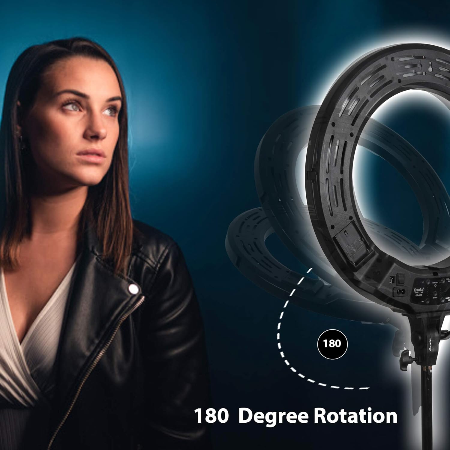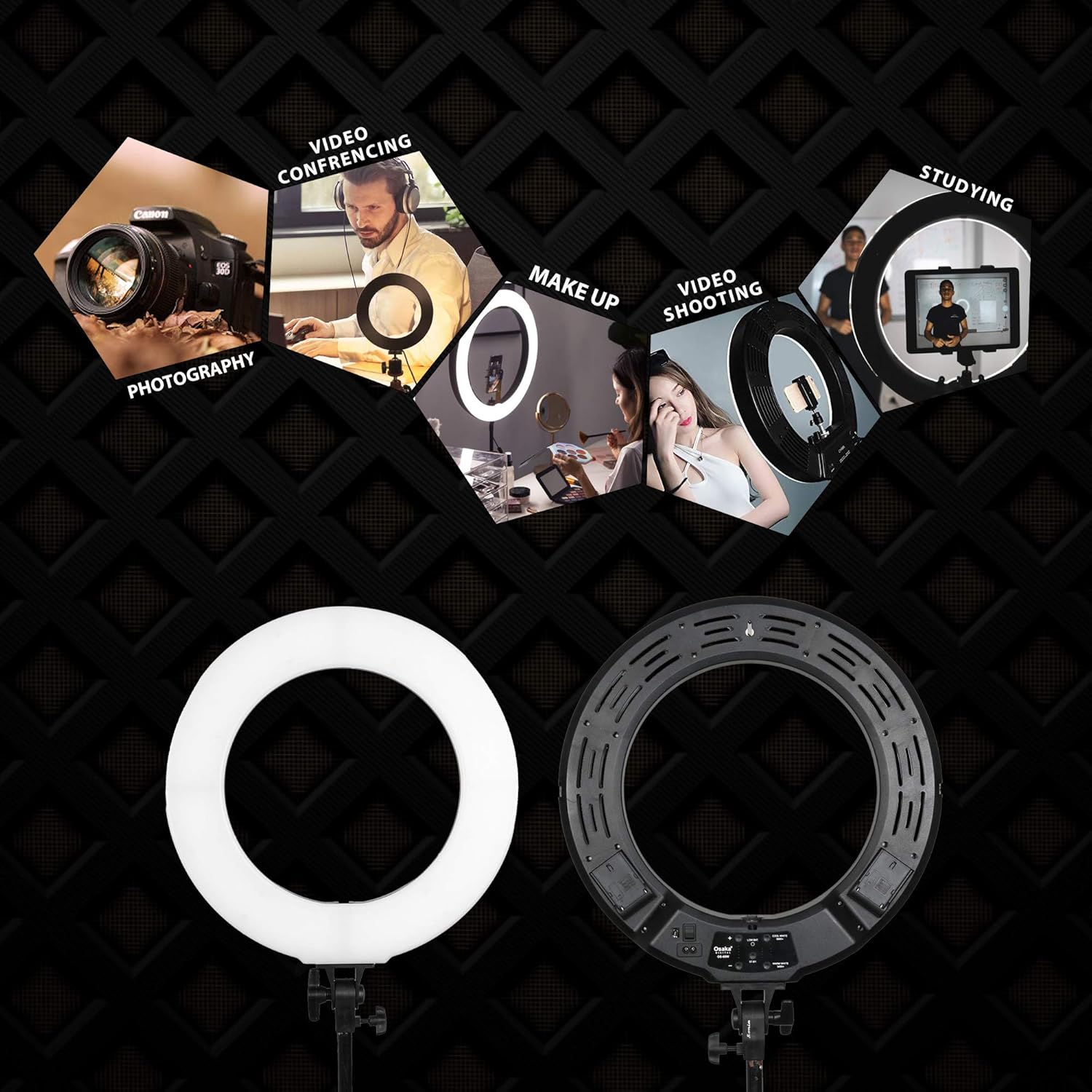 18 inch ring light with multiple variants of lighting (ranging from 3400K to 5600K color temperature, 0%-100% brightness adjustable). Back Panel shows the situation of brightness, color temp, perfect for different variety of photography. Also with brightness and color temperature remote controller