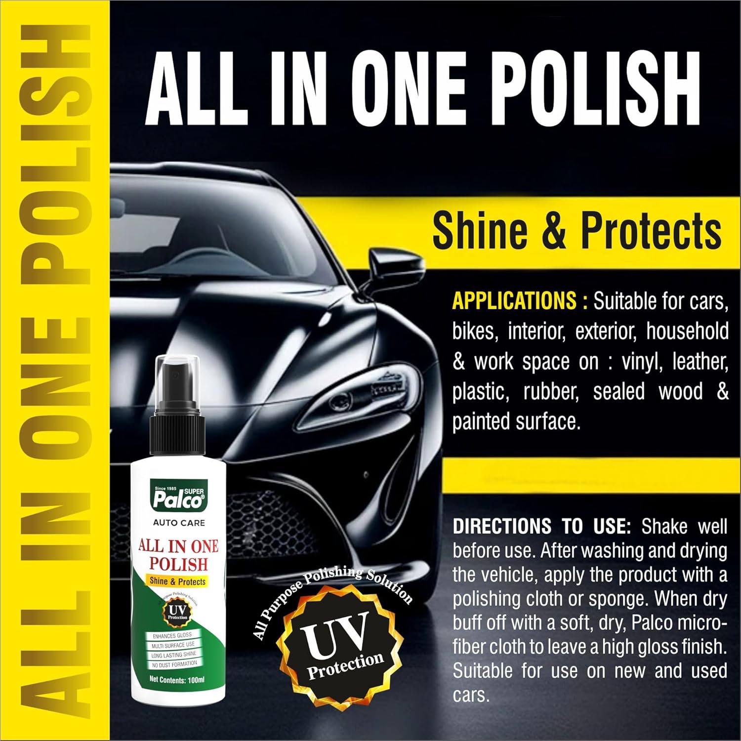 Keep your vehicle shining like new with the Palco Super Auto Care Combo Pack, an all-in-one car and bike care solution designed to clean, polish, and protect multiple surfaces. This premium kit includes Palco Windshield Cleaner (100ml), Palco All In One Polish (100ml), and Palco Shine Sponge (1 Pc) to deliver professional-grade cleaning and detailing at home. The powerful Windshield Cleaner Concentrate effortlessly removes road grime, fingerprints, insect stains, oils, and sediment to provide a crystal-clear, streak-free shine for enhanced visibility. The versatile All In One Polish adds a long-lasting gloss and UV protection to cars, bikes, dashboards, vinyl, leather, rubber, plastic, sealed wood, and painted surfaces, preventing dust formation and surface dullness. The easy-to-use Shine Sponge provides instant high-gloss shine, safely restoring the look of plastics, trims, and painted areas without leaving residue. Whether you own a sports bike, car, scooter, or motorcycle, this Palco combo ensures a showroom-like finish with minimal effort. Perfect for DIY vehicle maintenance, it saves time, enhances appearance, and protects your investment with a professional touch. Ideal for car enthusiasts, daily commuters, and anyone who values a spotless, polished ride.