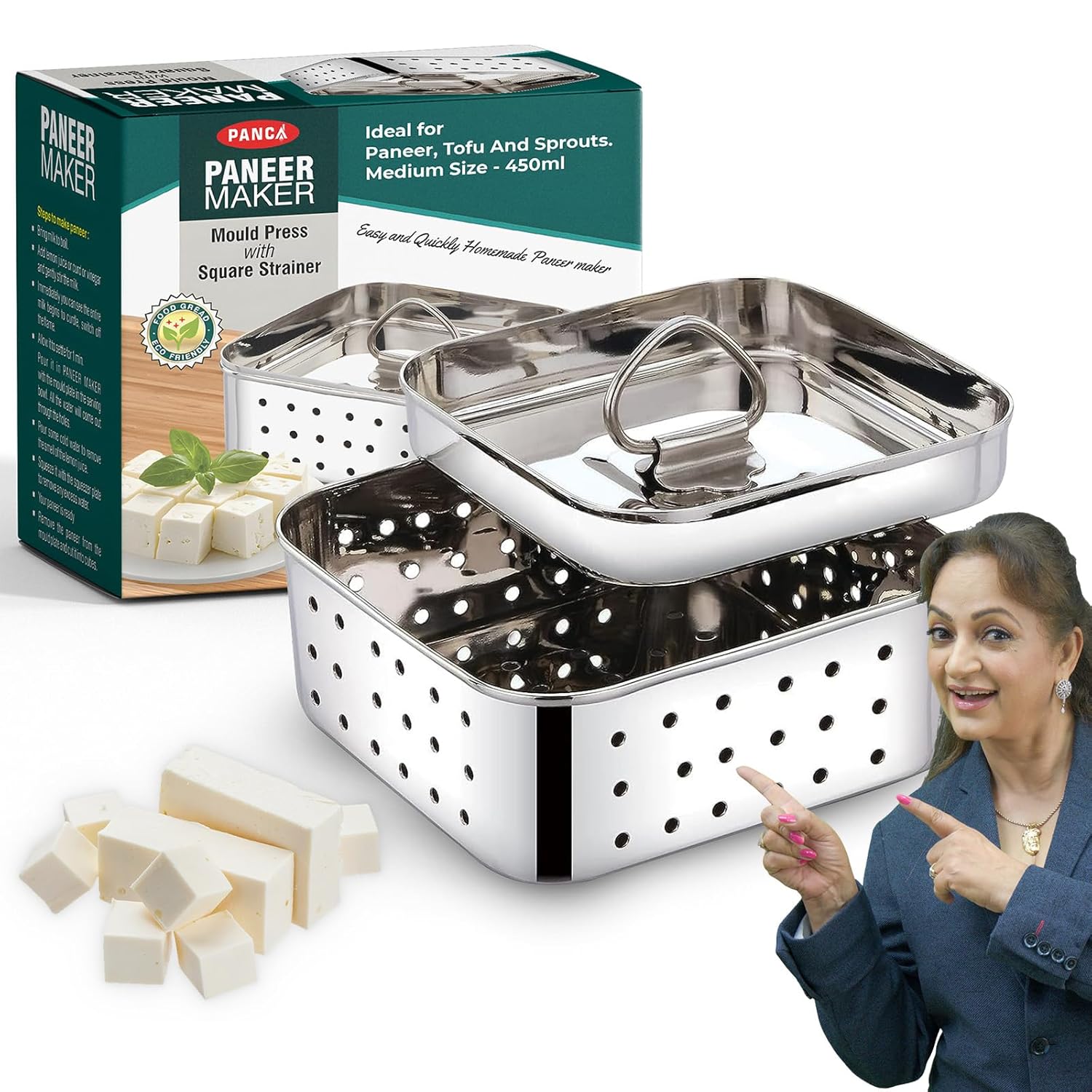 PANCA Stainless Steel Paneer Maker Mould Medium Size, Paneer Press with Lid, Tofu Press Mould Maker, Whey Seperator (Square, 450ml Capacity)