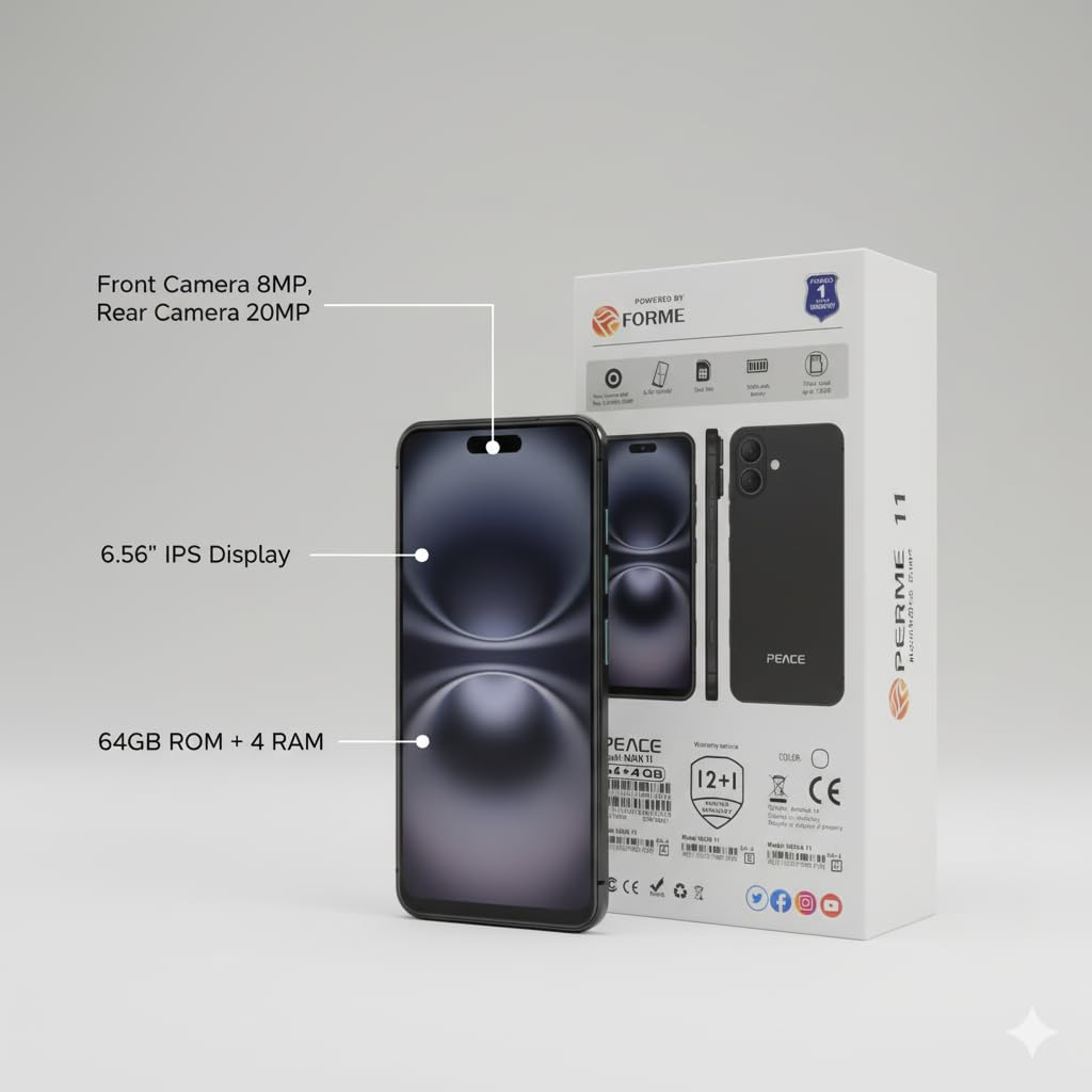 PEACE NOVA 11 4G Smartphone with 6.56-inch Display, Android 14, 4GB RAM, 64GB Storage, 20MP Camera, 5000mAh Battery, MTK6739 Quad-Core Processor (Black)
