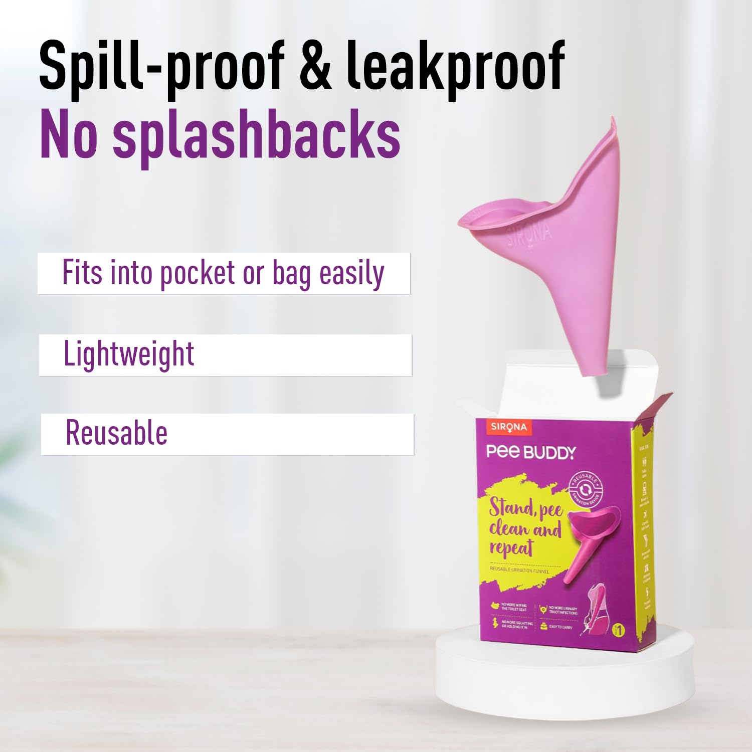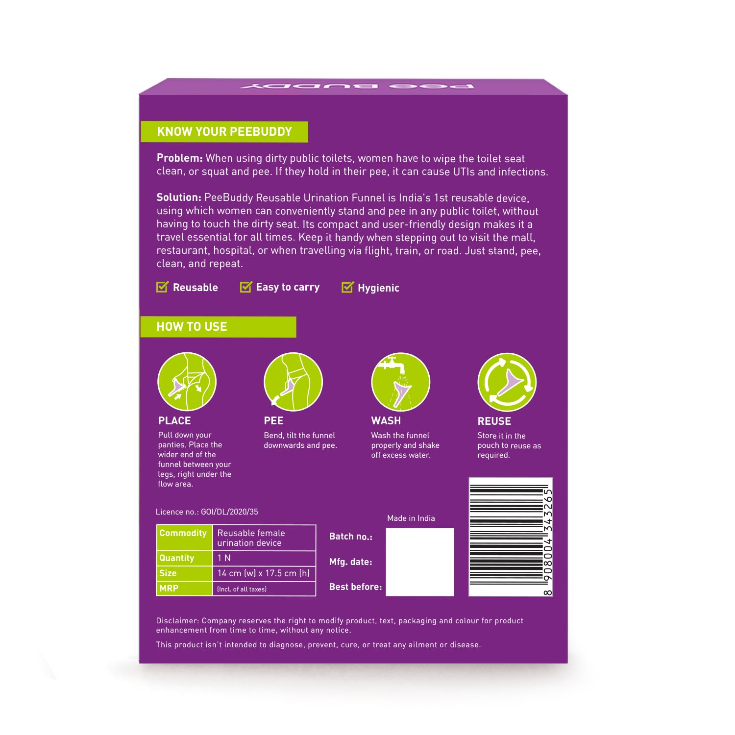 SOLUTION FOR DIRTY BATHROOMS: Made in India, first portable, reusable female urination device for women using which women can stand and urinate in all public and common toilets. Ideal for use in dirty toilets while travelling (flights, train, highways) for work or leisure (treks, camping, hiking, marathons, road trips, events) or those with medical conditions (Arthritis, Pregnancy, etc.)