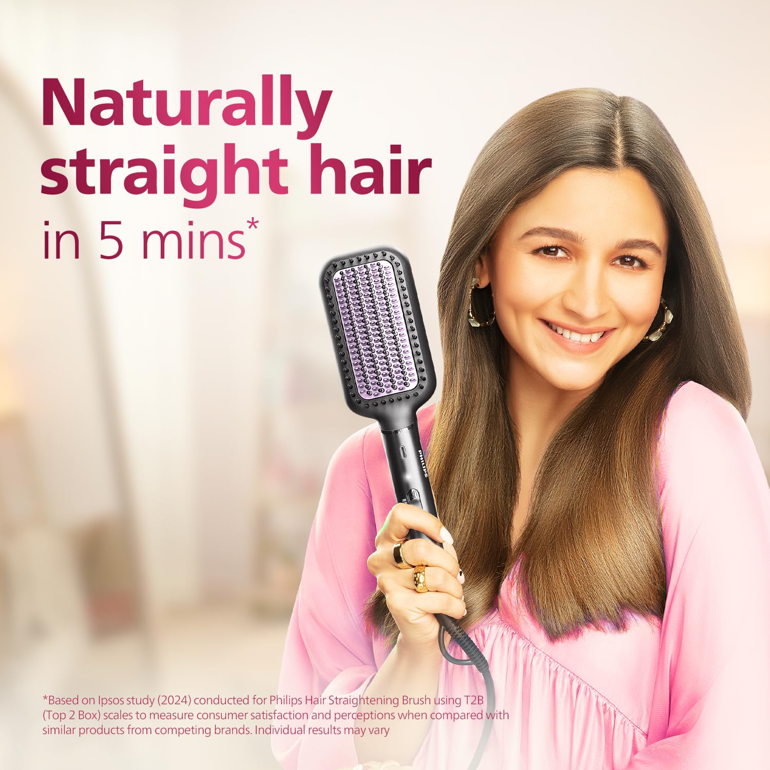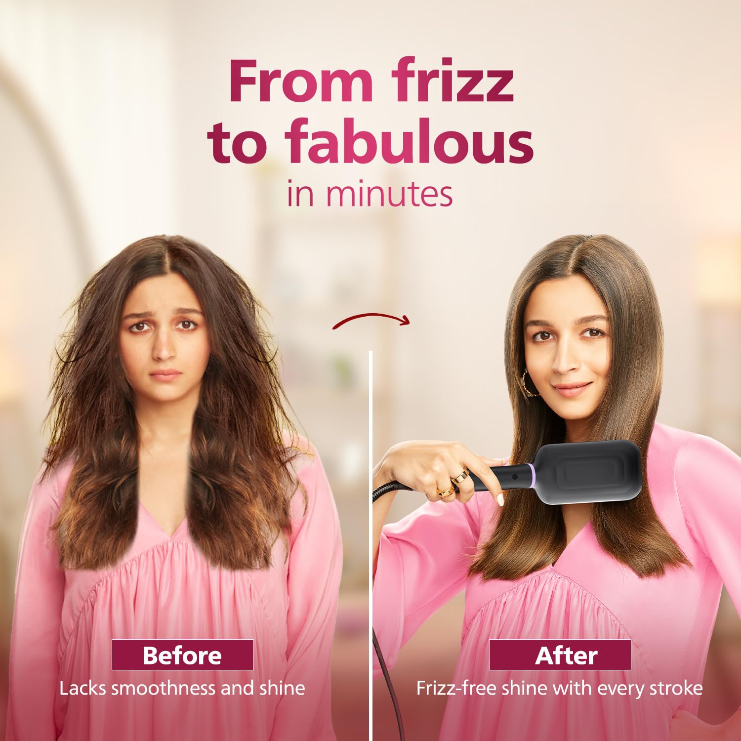 PHILIPS Hair Straightener Brush – 5X Better Frizz Free Hair In 5Min I Style With 2X More Volume|Shiny And Smooth Hair I No Scalp Burns I Keratin Bristles I 2 Temperature Settings|Bhh880/10,Black