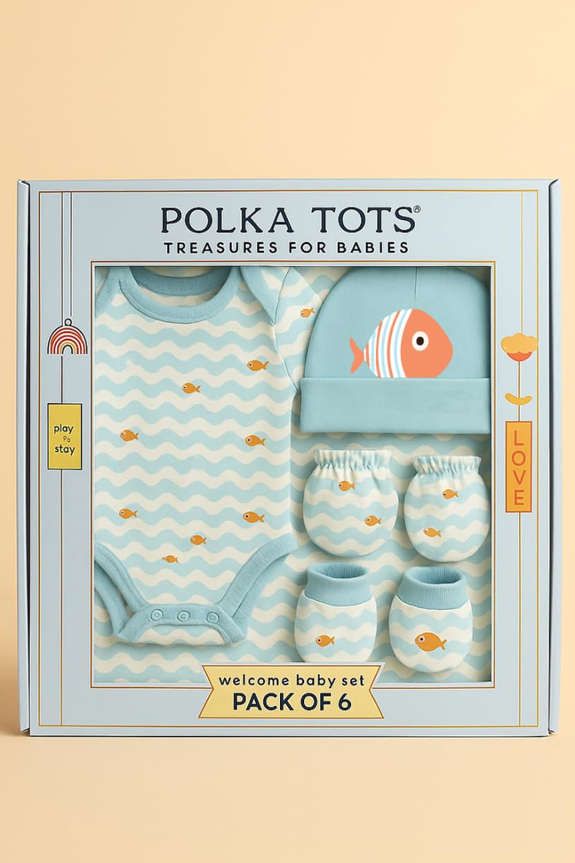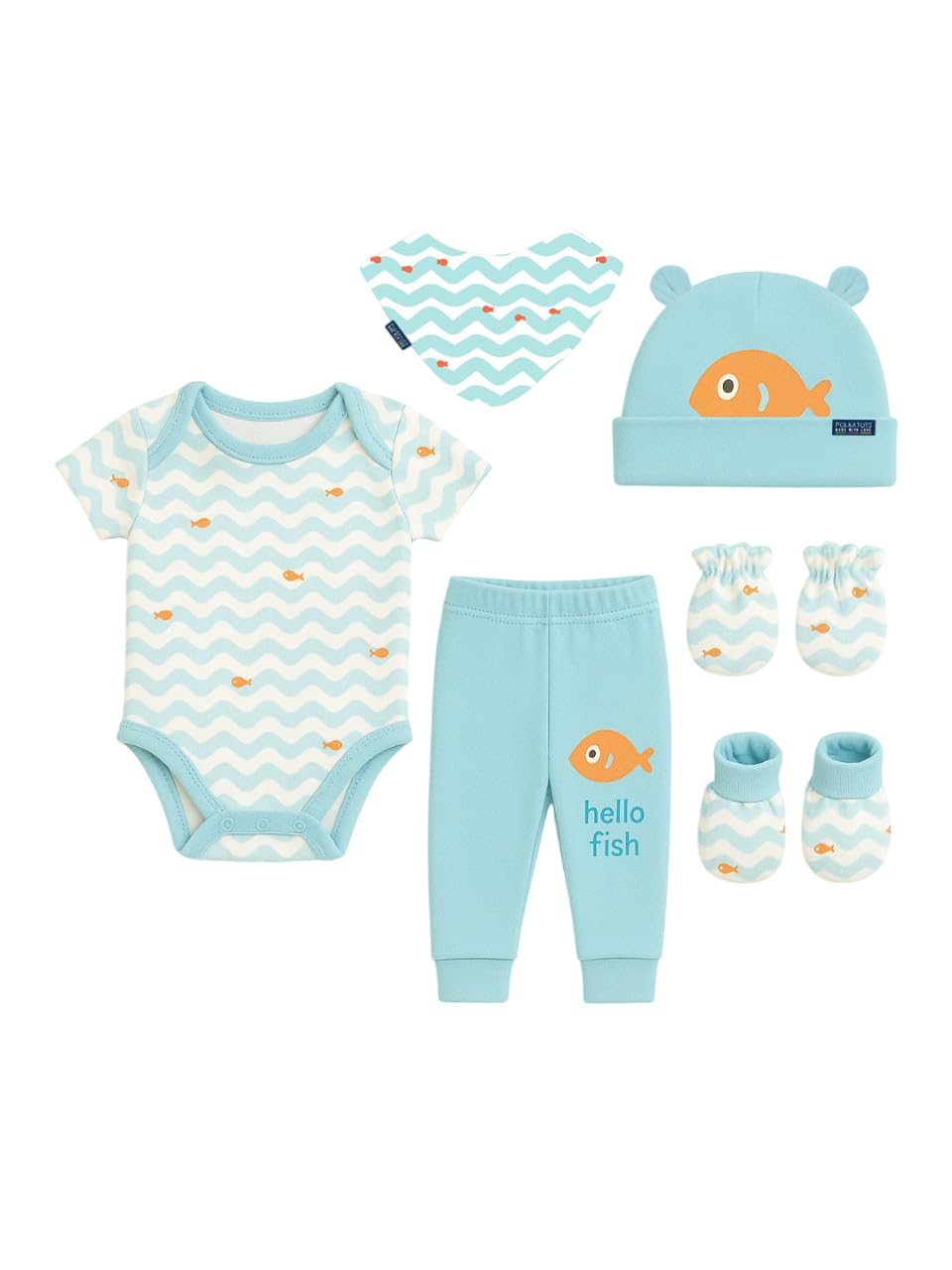 Combo Set with Coordinated Must-Haves Includes 6 essential items in one thoughtfully curated box: 1 Onesie 1 Bottom 1 Cap 1 Pair of Booties 1 Pair of Mittens 1 Bandana Bib