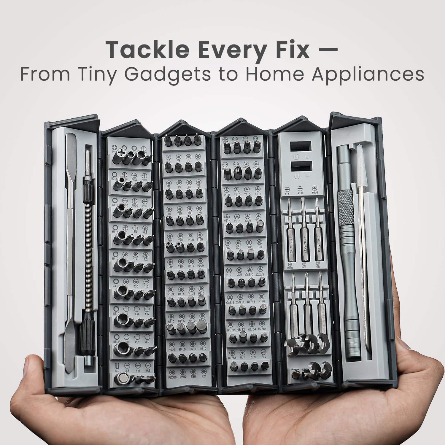 128-in-1 Precision Screwdriver Kit – Tackle any electronics or DIY repair with a wide selection of bits including Phillips, Flathead, Torx, Pentalobe, Tri-Wing, Hex, Pozidriv, U-type, Square, Triangle, and more. Whether it’s a phone, tablet, camera, drone, laptop, or watch – Bit Box 2 has the right tool.