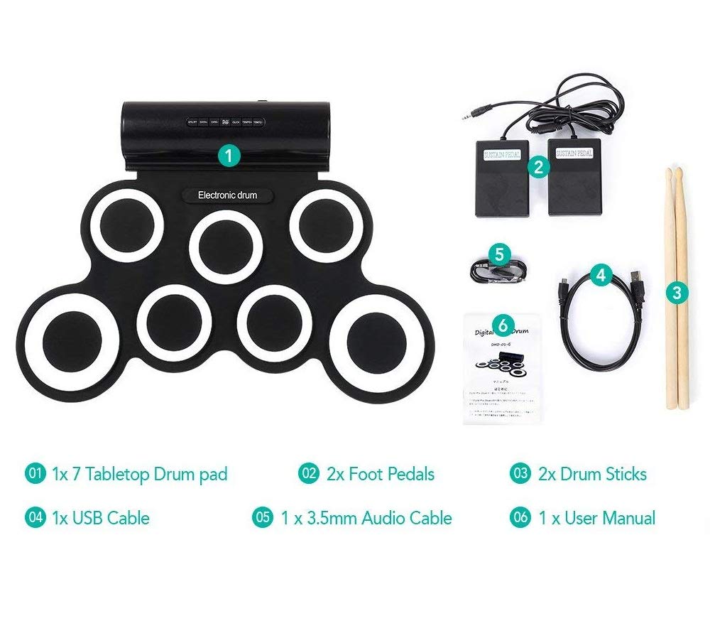 Package contain: – 1 x roll up drum, 2 x drum sticks, 1 x USB cable, 1 x 3.5mm audio cable, 1 x user manual