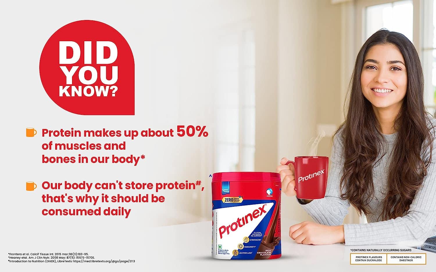 Lack of protein leads to loss of muscle strength which in turn leads to frequent tiredness and fatigues in our daily lives. Protein makes up about 50% of muscles & bones in our body and our body cannot store protein – hence it needs to be consumed daily! Protinex helps in bridging this gap of protein and other essential nutrients in regular Indian Adult diets. Protinex should be consumed daily as part of a healthy lifestyle for everyday health.