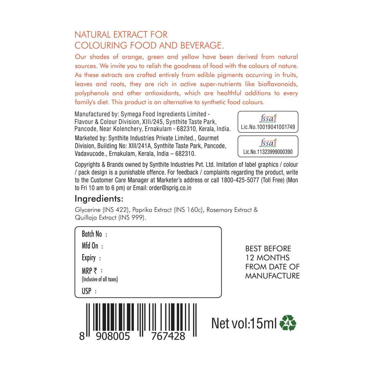 Natural Food Colour: 100% Natural, Plant Based; Made From The Extract Of Real Paprika