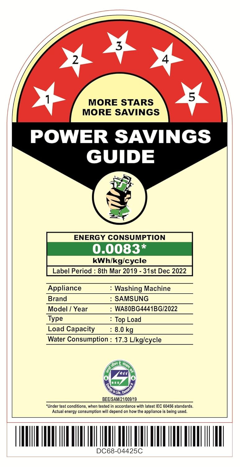 Energy Star rating : 5 Star | Digital Inverter for energy savings | Energy Consumption: 0.0083 KWh/kg/cycle (For more information refer to BEE Label)
