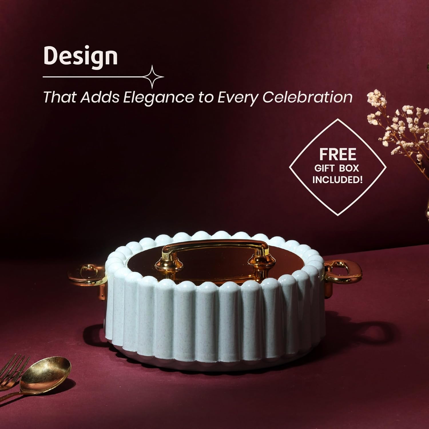 Stylish and Elegant Design: Ridge Pattern: Enhances the visual appeal of your serveware. Gold-Finish Handles: Ergonomically designed for a luxurious touch and easy handling.