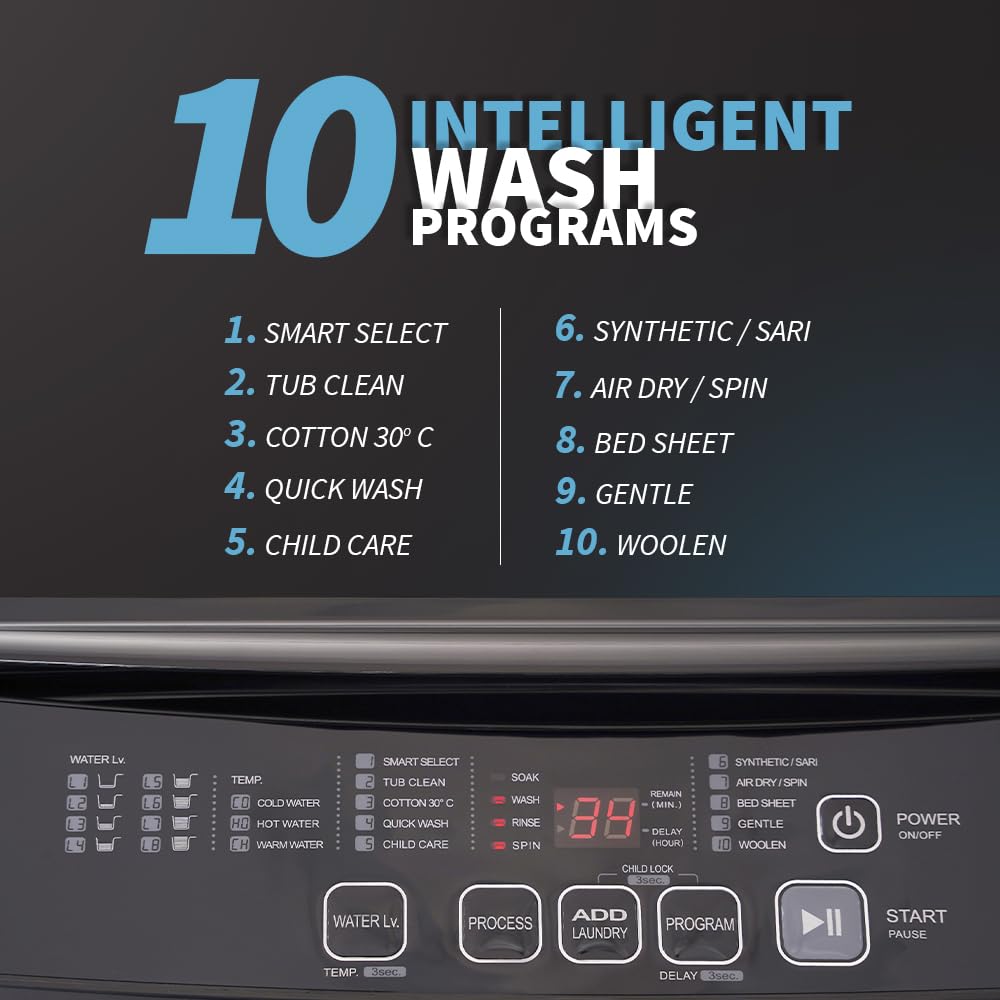 Wash Programs : 10 Wash Programs – Smart Select, Tub Clean, Cotton 30°C, Quick Wash, Child Care, Synthetic/Saree, Air Dry, Bed Sheet, Gentle, Woollen | Panel – Touch panel & Digital display.