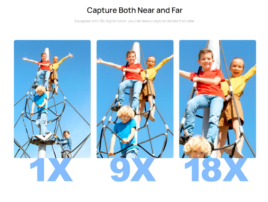 𝐄𝐟𝐟𝐨𝐫𝐭𝐥𝐞𝐬𝐬 𝐙𝐨𝐨𝐦 & 𝐀𝐮𝐭𝐨𝐟𝐨𝐜𝐮𝐬 : Get up close from afar with 18× digital zoom and never miss a moment thanks to fast autofocus that keeps moving subjects crisp and clear