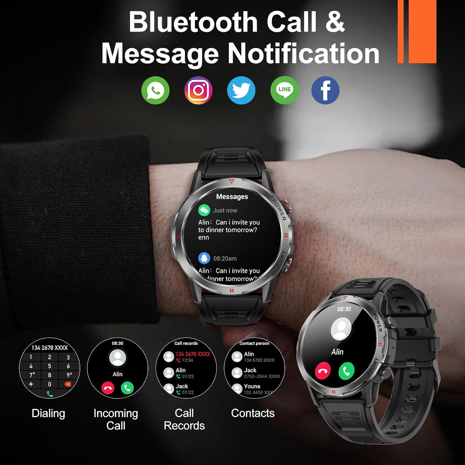 Make/answer Calls & Message Notifications: You can make/receive phone calls directly on the smart sports watch and receive notifications/reminders through SMS/email/applications in a timely manner. Whether you are exercising or in a meeting, you can always stay in touch with your family and friends.
