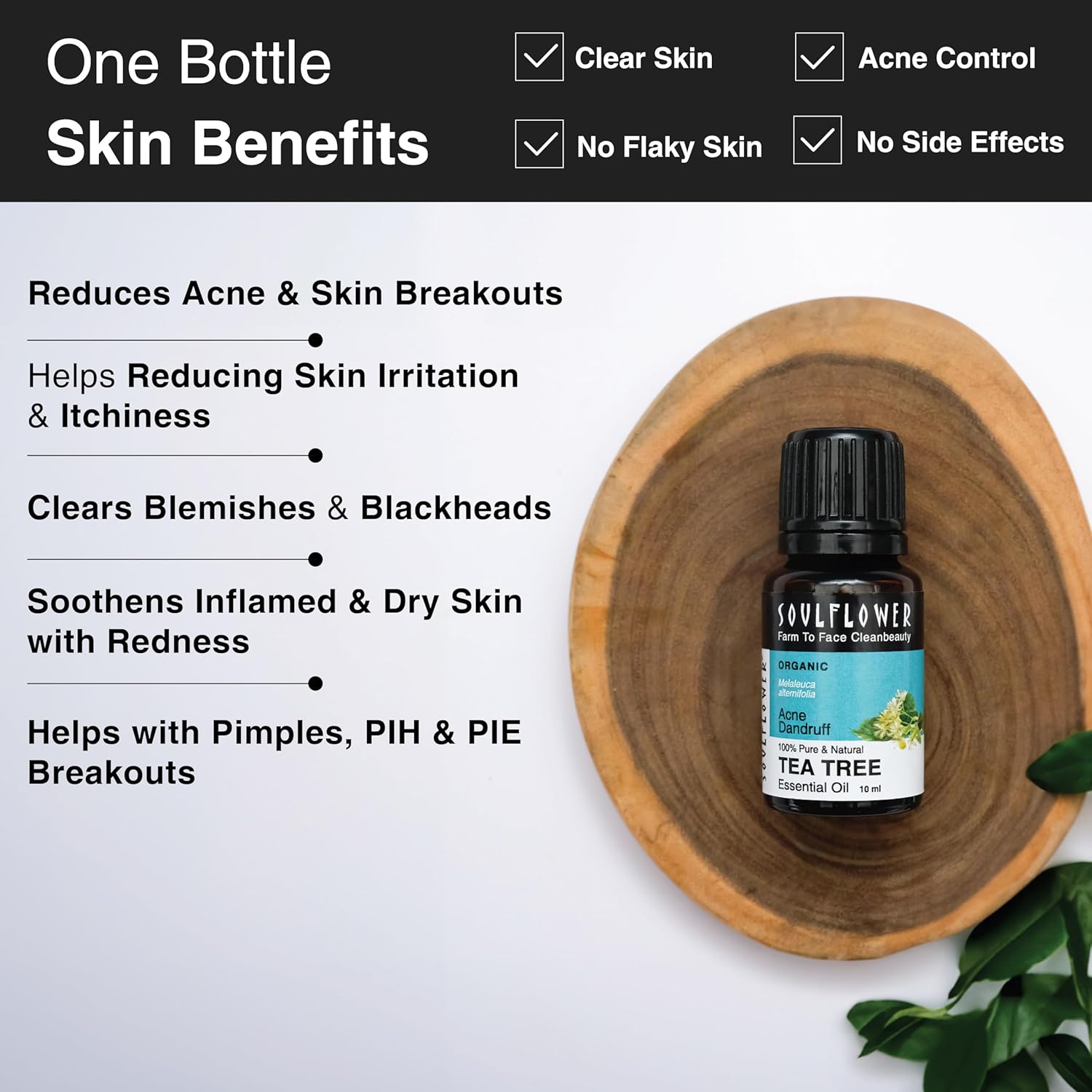EFFORTLESSLY CLEAR SKIN: Soulflower TeaTree Essential Oil reduces acne, makes skin softer and smoother, reduces blemishes, redness, itching, and dark spots