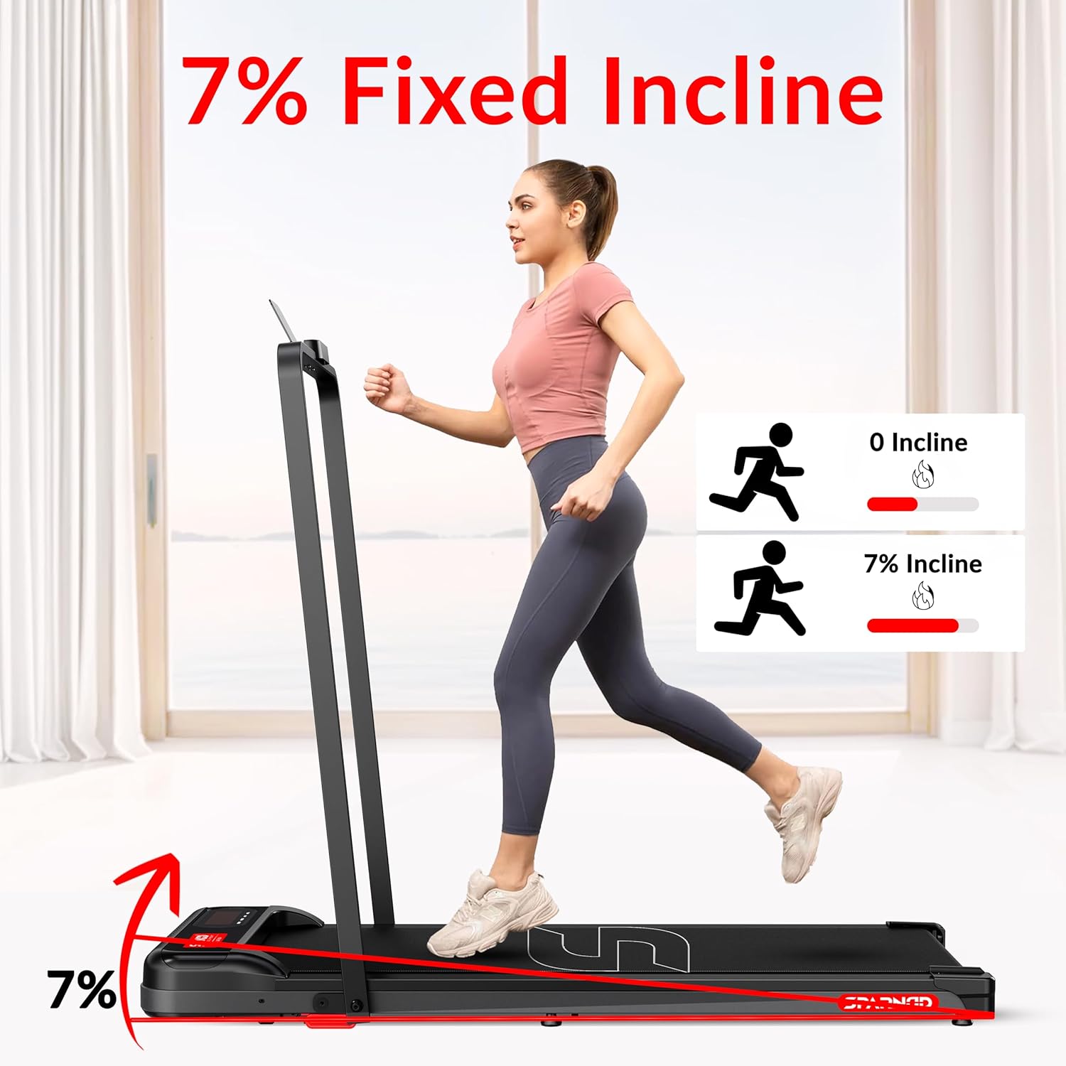 ● Boost Calorie Burn with 7% Fixed Incline: Take walking workouts to the next level with a built-in 7% incline that naturally increases intensity without increasing speed. This gentle slope helps engage more muscle in the glutes, calves, and hamstrings while improving cardiovascular performance and calorie burn. It stimulates uphill walking indoors, and the incline also supports better joint alignment and reduces impact on knees compared to flat-surface walking.