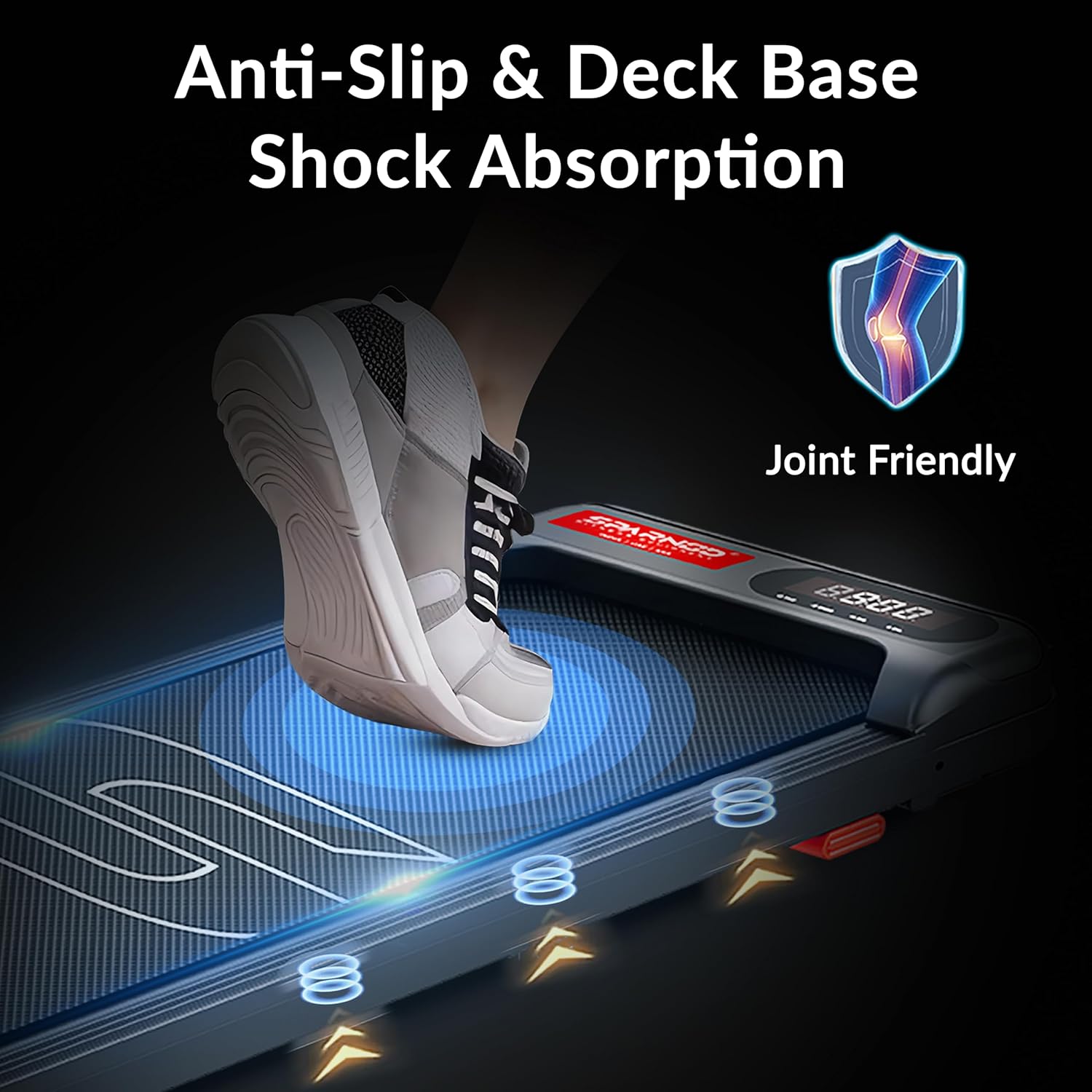 ● Advanced Shock Absorption: Sparnod Fitness walking pad has a multi-layer cushioning system that absorbs shock with each step, enabling a softer, low-impact walking surface experience. The walking pad is specially engineered with a 12mm thick walking deck combined with a durable 1.4mm wear-resistant belt, enabling a natural stride with every step.