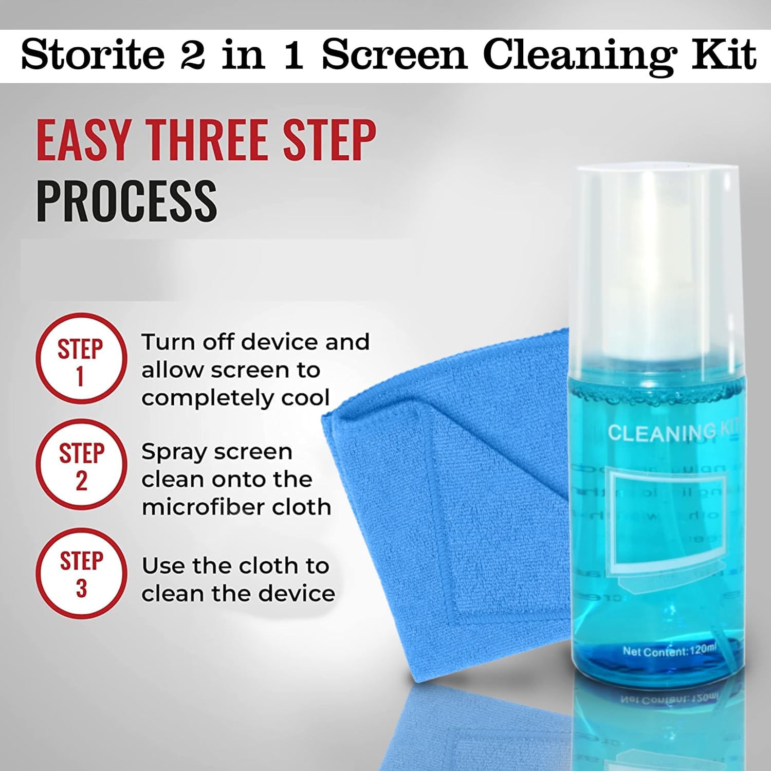 Complete Cleaning Solution: The Storite 2 in 1 Professional Screen Cleaning Kit (Pack Of 2) includes a 120ML cleaning solution and a plush microfiber cloth-30cm x 30cm, designed to safely clean and maintain a variety of screens including laptops, mobiles, tablets, and more.