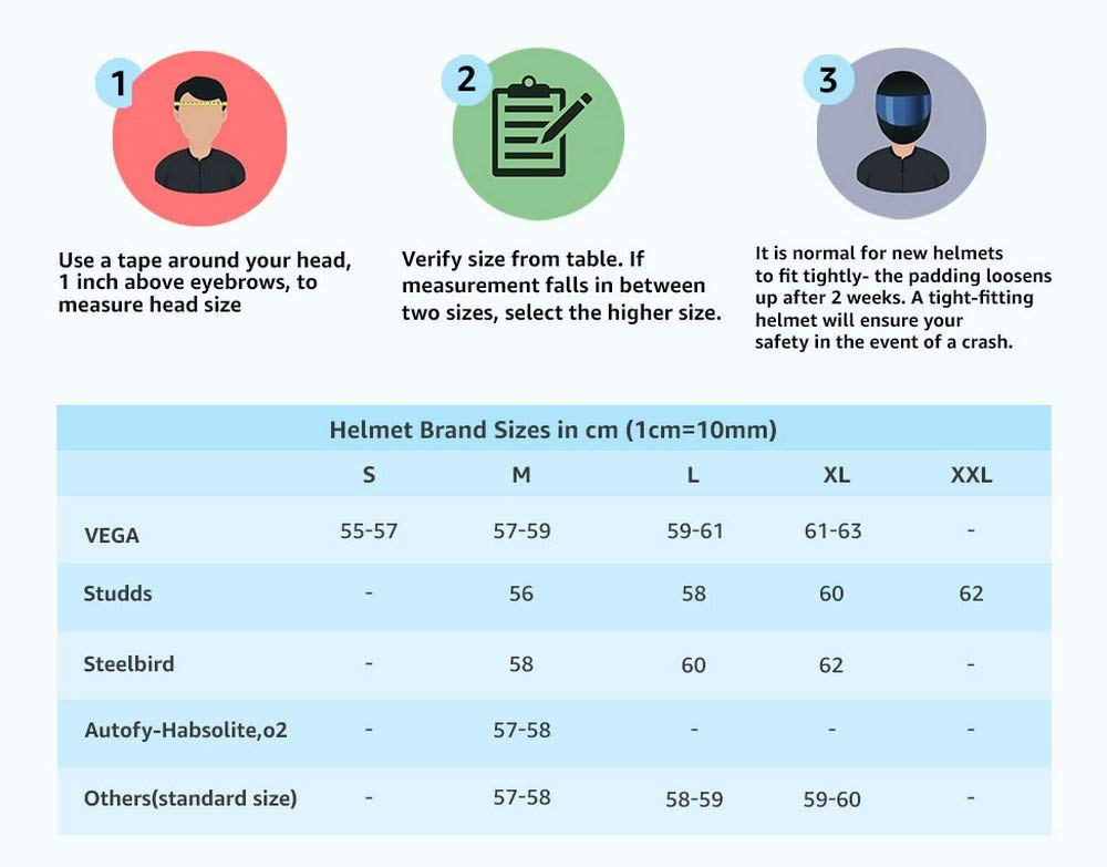 Moveable chin guard with single button flip up mechanism. Polycarbonate visor duly silicon hard coated for scratch resistance properties. Quick release chinstrap mechanism for ease of operation and safety. Ventilation system for more comfort to the rider while driving. Outer shell injected from special high impact grade of engineering thermoplastic. Regulated density eps concussion padding lined with specially treated anti allergic velveteen. High quality U. V. Resistant polyurethane paints used for aesthetic enhancement. Spare visors available in clear, smoke tint, mirror and rainbow options. Available in xs(540 mm), s(560 mm), m(570 mm), l (580 mm) and xl (600 mm) sizes.