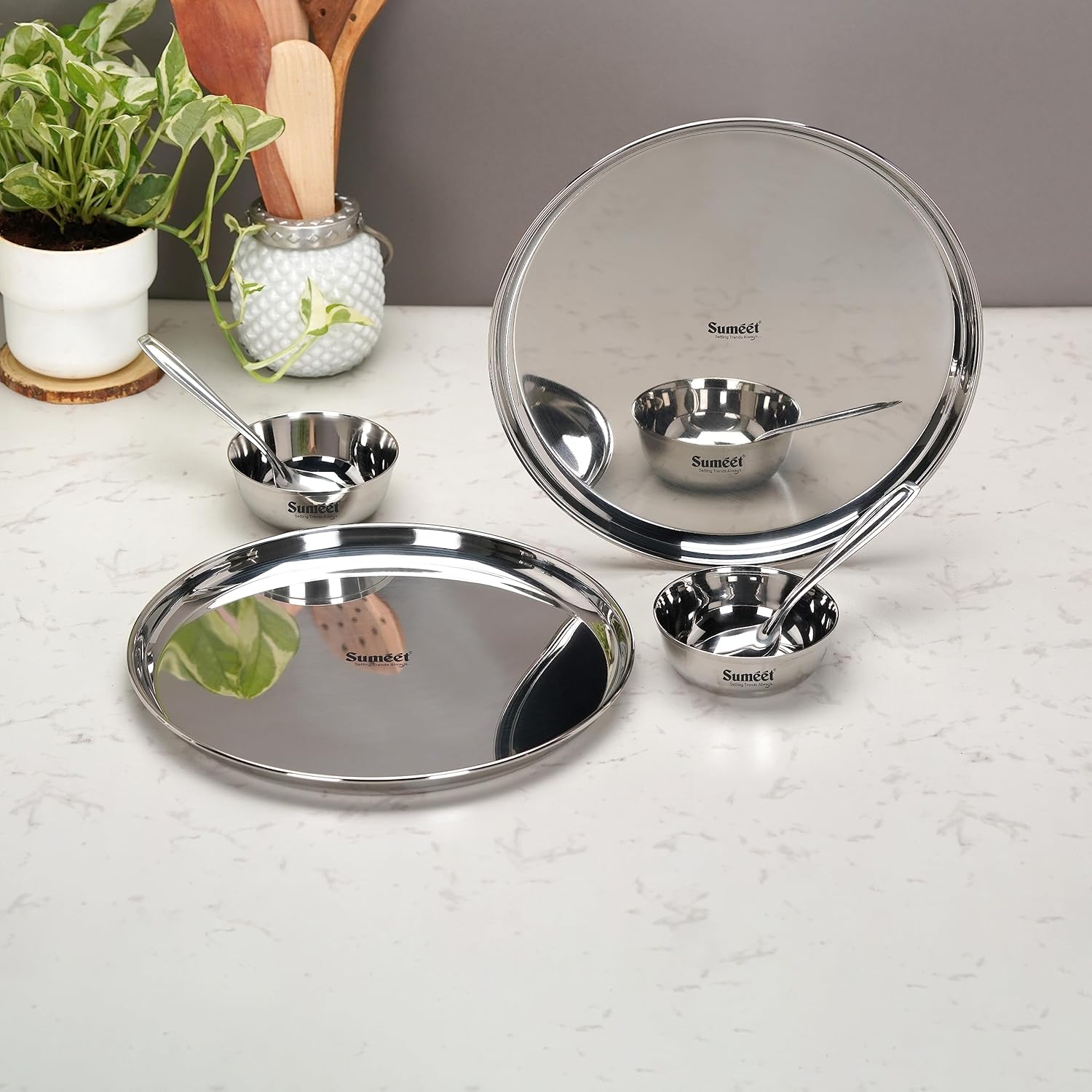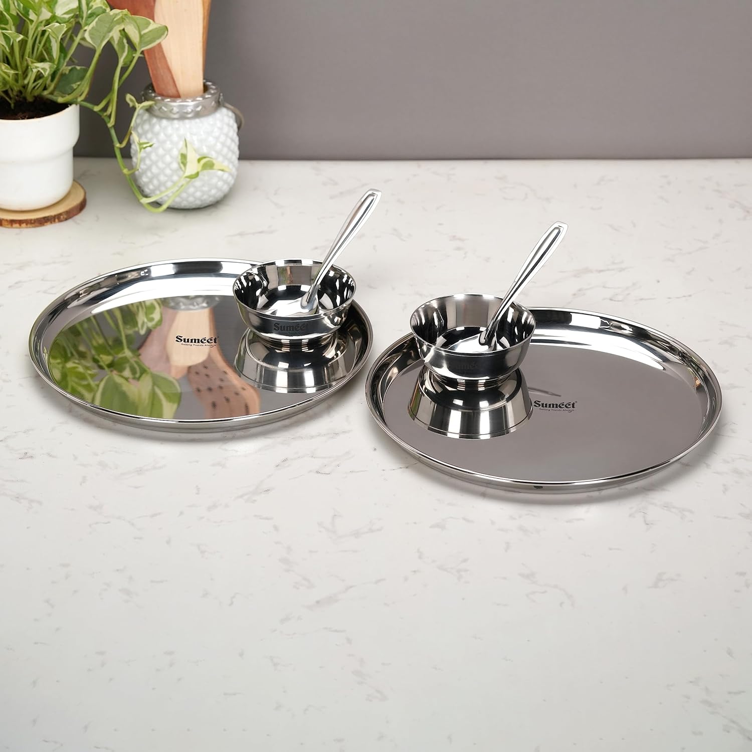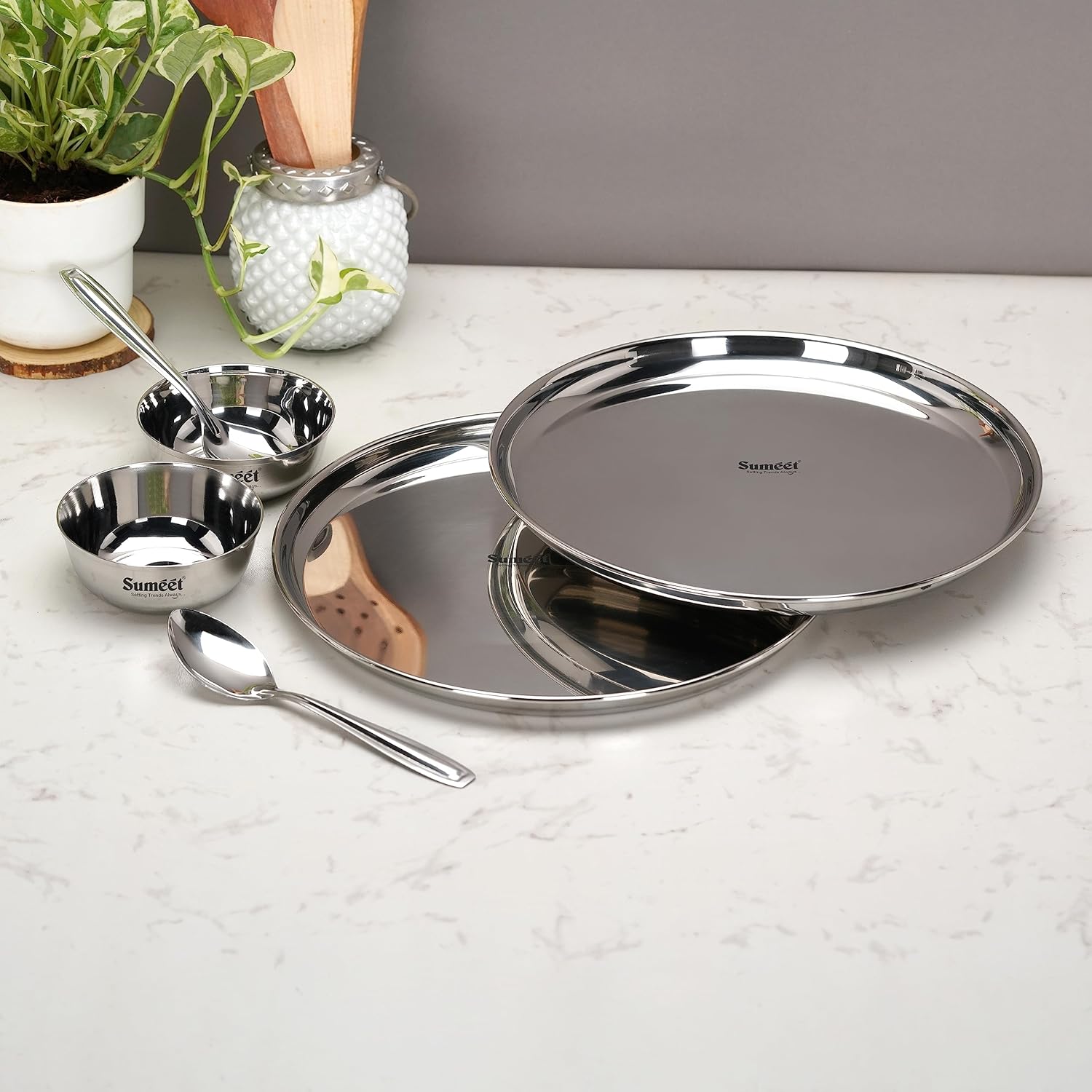 The combination of the stainless-steel plates, two small bowls, and two spoons make this set ideal for a variety of dining occasions. Whether you are hosting a dinner party or simply enjoying a meal with family and friends, this set offers versatility and style. Furthermore, the stainless-steel construction ensures the set’s durability and resistance to rust, corrosion, and staining.