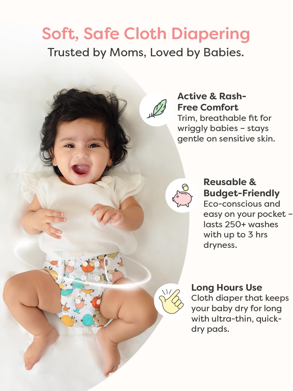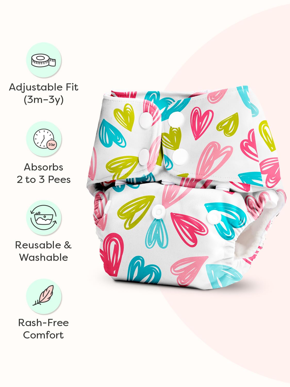 🔁 Adjustable Fit – Snap buttons give a custom fit for every growth stage (5 kg–17 kg babies) ♻️ Rash-Free Comfort – Gentle, reusable diaper designed to reduce rashes and irritation