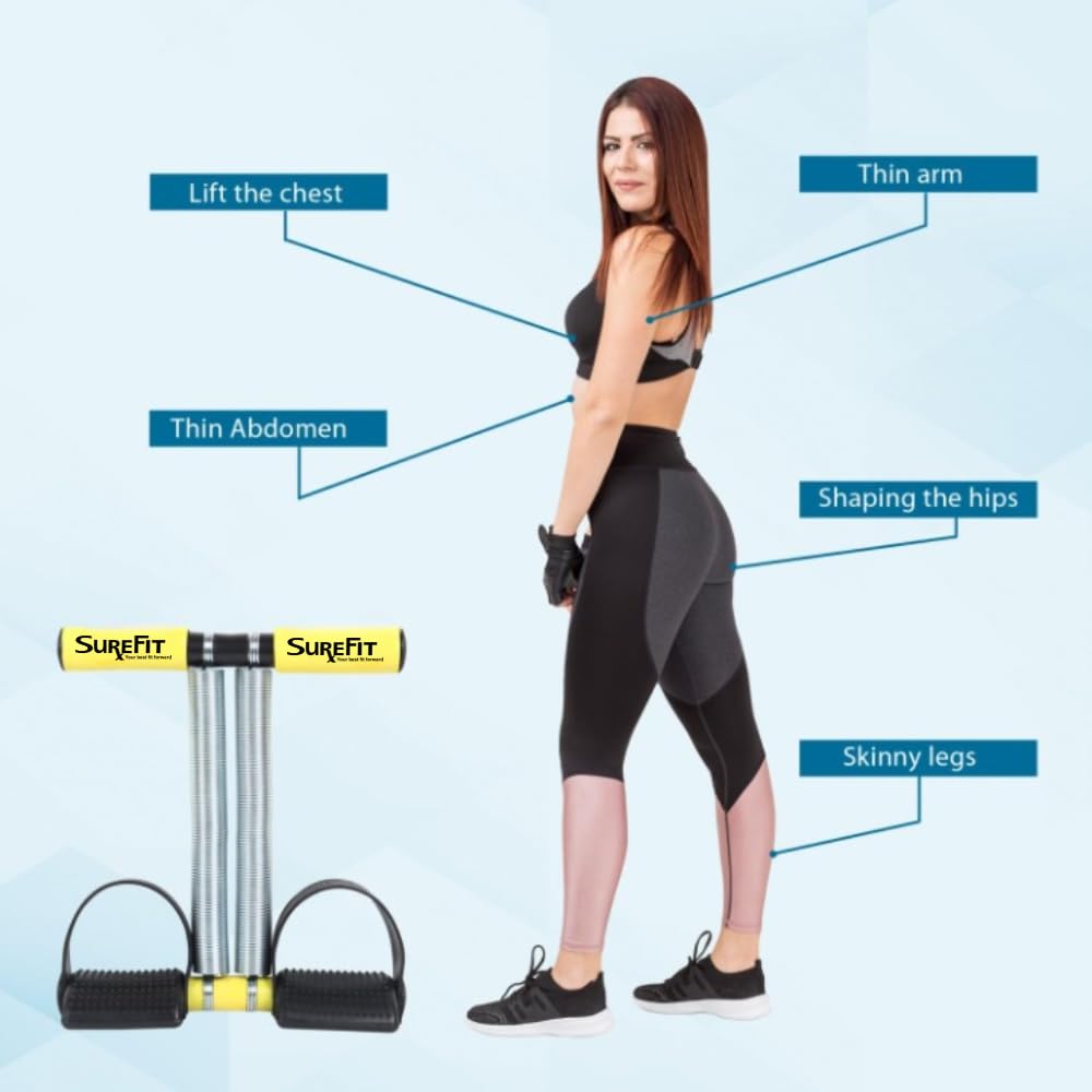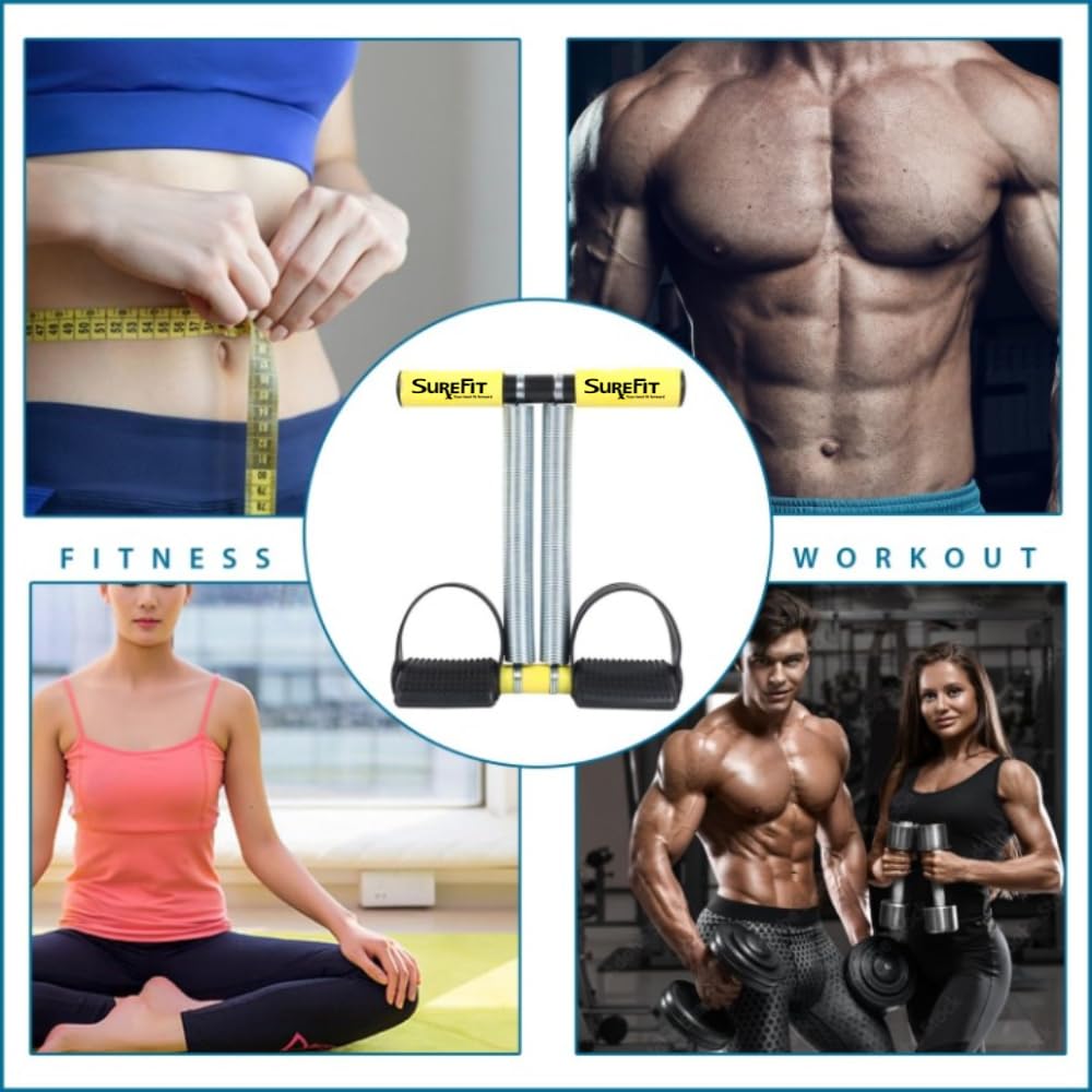 SUREFIT Tummy Trimmer for Men & Women – Double Spring Ab Exerciser with Foam Handle & Resistance Band – Full Body Fitness Combo Tool Kit for Abs, Legs, Arms, Chest & Home Gym Workout (YELLOW)