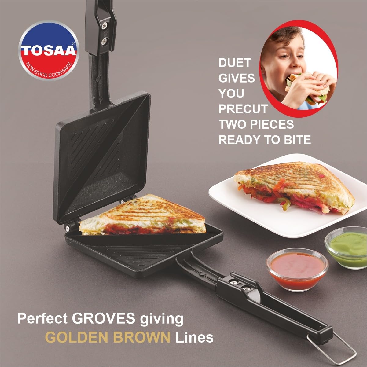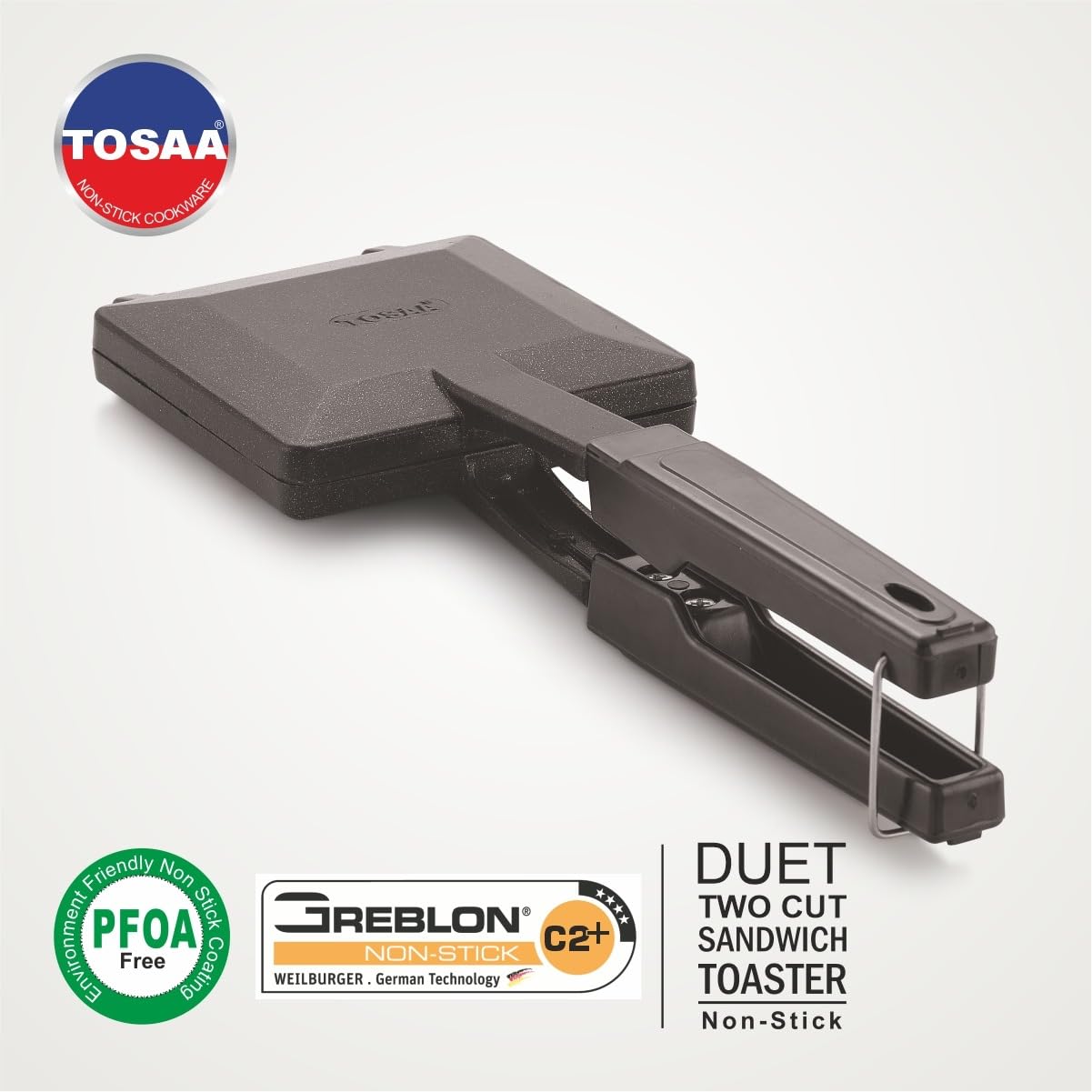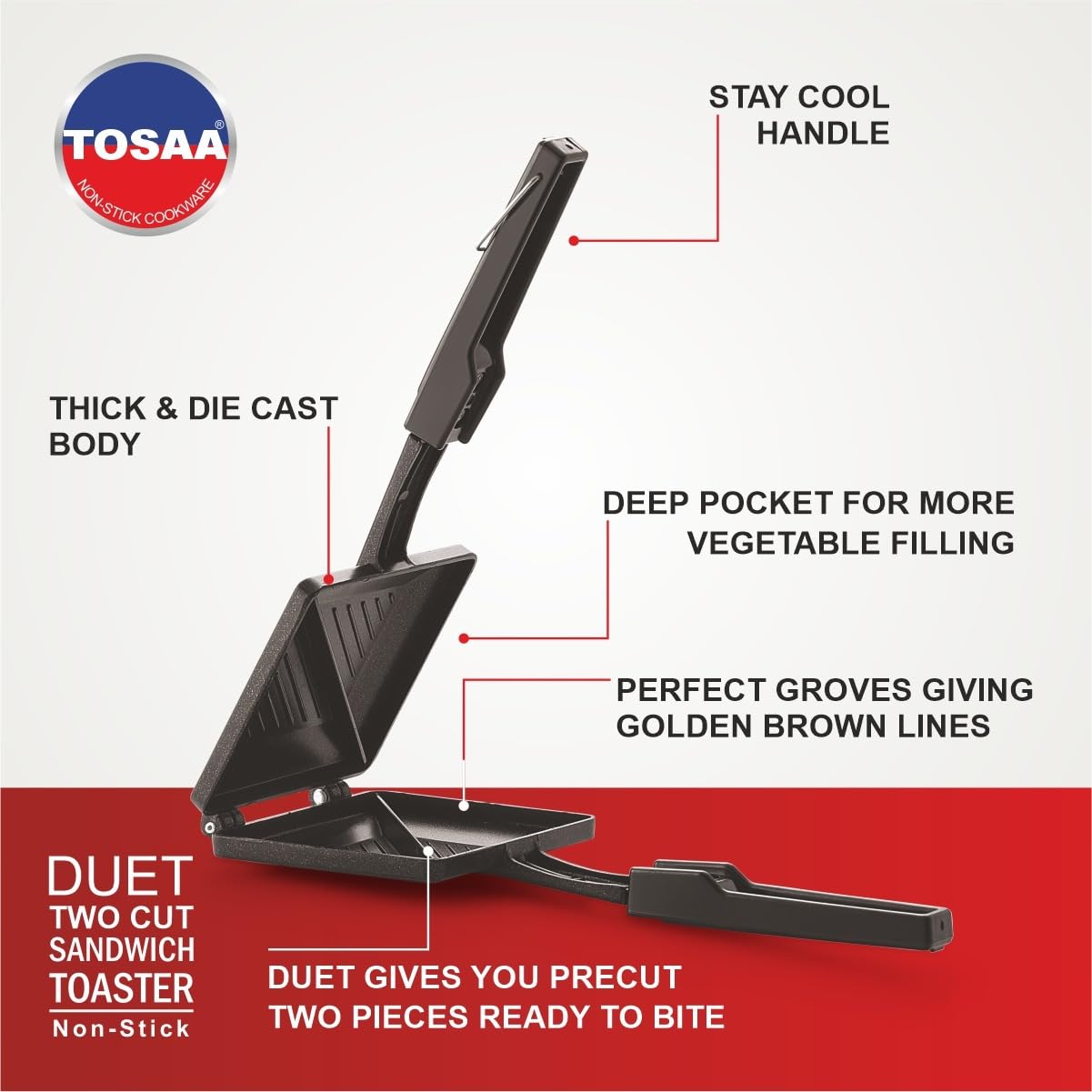 Tosaa – TSTDUET Duet 2-Cut Gas Sandwich Toaster Non-Stick Aluminium | Compatibility with Gas Stoves | Flame-Proof Design | Heat-Resistant Handle | Sandwich Maker | Black